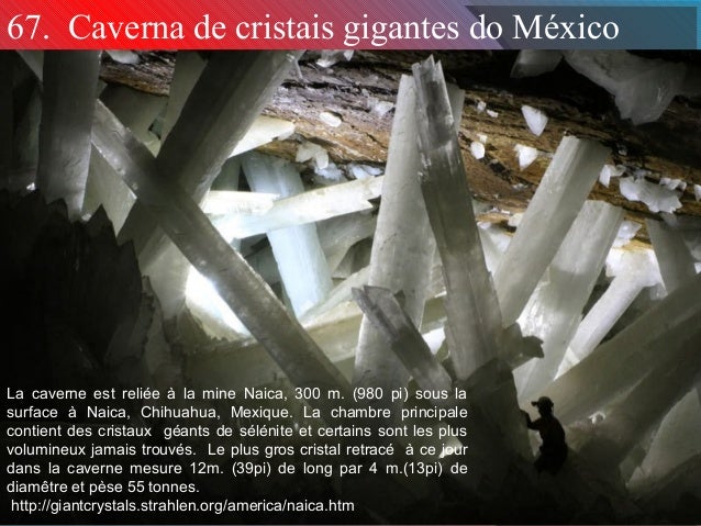 11. 11. 67. Caverna de cristais gigantes do México La caverne est reliée à la mine Naica, 300 m. (980 pi) sous la surface à Naica, Chihuahua, Mexique. La chambre principale contient des cristaux géants de sélénite et certains sont les plus volumineux jamais trouvés. Le plus gros cristal retracé à ce jour dans la caverne mesure 12m. (39pi) de long par 4 m.(13pi) de diamêtre et pèse 55 tonnes. http://giantcrystals.strahlen.org/america/naica.htm