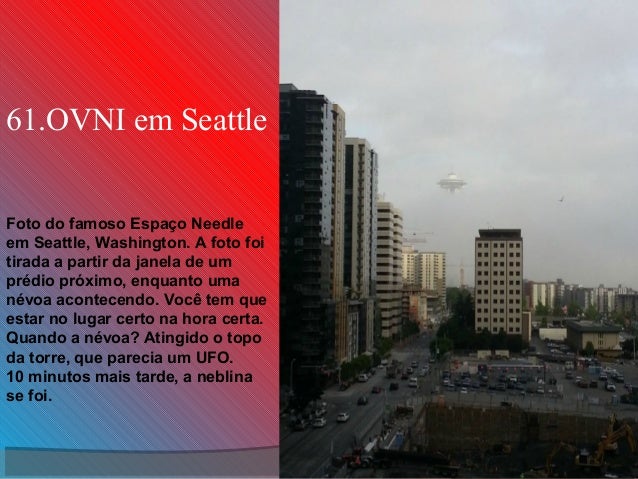17. 17. 61.OVNI em Seattle Foto do famoso Espaço Needle em Seattle, Washington. A foto foi tirada a partir da janela de um prédio próximo, enquanto uma névoa acontecendo. Você tem que estar no lugar certo na hora certa. Quando a névoa? Atingido o topo da torre, que parecia um UFO. 10 minutos mais tarde, a neblina se foi.