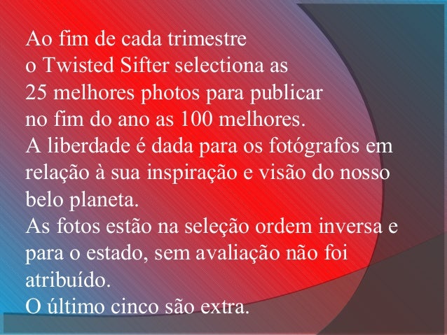 2. 2. Ao fim de cada trimestre o Twisted Sifter selectiona as 25 melhores photos para publicar no fim do ano as 100 melhores. A liberdade é dada para os fotógrafos em relação à sua inspiração e visão do nosso belo planeta. As fotos estão na seleção ordem inversa e para o estado, sem avaliação não foi atribuído. O último cinco são extra.