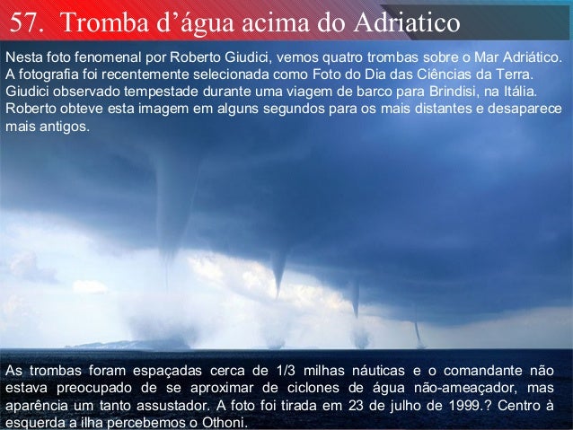 21. 21. 57. Tromba d’água acima do Adriatico Nesta foto fenomenal por Roberto Giudici, vemos quatro trombas sobre o Mar Adriático. A fotografia foi recentemente selecionada como Foto do Dia das Ciências da Terra. Giudici observado tempestade durante uma viagem de barco para Brindisi, na Itália. Roberto obteve esta imagem em alguns segundos para os mais distantes e desaparece mais antigos. As trombas foram espaçadas cerca de 1/3 milhas náuticas e o comandante não estava preocupado de se aproximar de ciclones de água não-ameaçador, mas aparência um tanto assustador. A foto foi tirada em 23 de julho de 1999.? Centro à esquerda a ilha percebemos o Othoni.