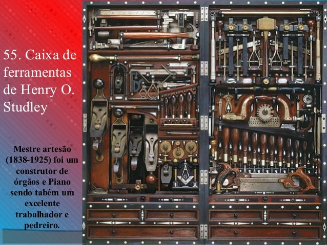 23. 23. 55. Caixa de ferramentas de Henry O. Studley Mestre artesão (1838-1925) foi um construtor de órgãos e Piano sendo tabém um excelente trabalhador e pedreiro.