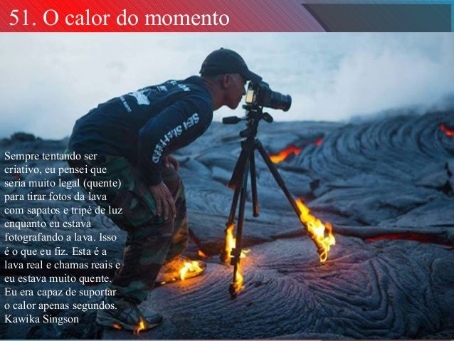 27. 27. 51. O calor do momento Sempre tentando ser criativo, eu pensei que seria muito legal (quente) para tirar fotos da lava com sapatos e tripé de luz enquanto eu estava fotografando a lava. Isso é o que eu fiz. Esta é a lava real e chamas reais e eu estava muito quente. Eu era capaz de suportar o calor apenas segundos. Kawika Singson