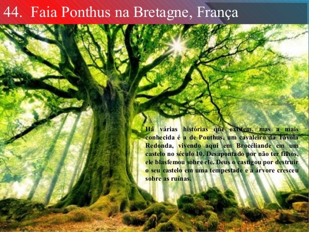 34. 34. 44. Faia Ponthus na Bretagne, França Há várias histórias que existem, mas a mais conhecida é a de Ponthus, um cavaleiro da Távola Redonda, vivendo aqui em Brocéliande em um castelo no século 10. Desapontado por não ter filhos, ele blasfemou sobre ele. Deus o castigou por destruir o seu castelo em uma tempestade e a árvore cresceu sobre as ruínas.