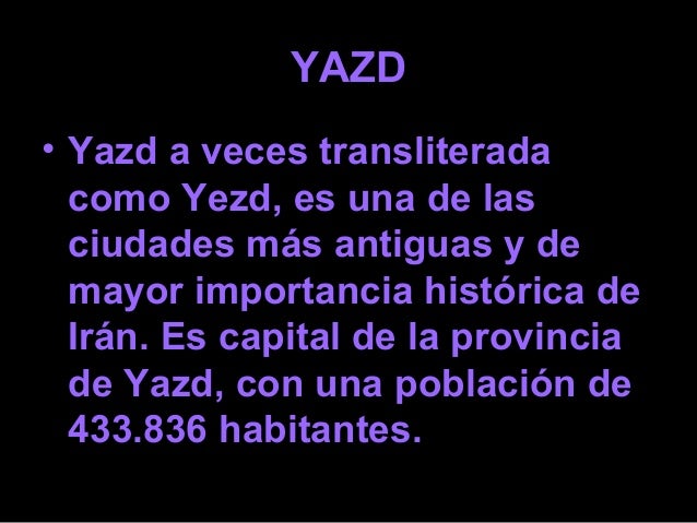 1. 1. YAZD • Yazd a veces transliterada como Yezd, es una de las ciudades más antiguas y de mayor importancia histórica de Irán. Es capital de la provincia de Yazd, con una población de 433.836 habitantes.