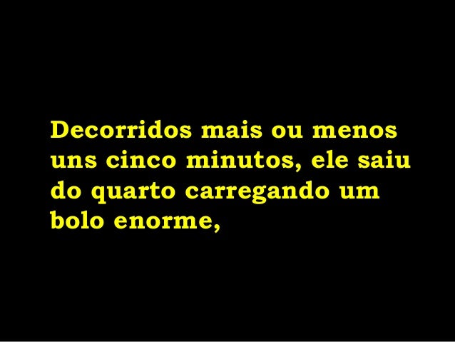 17. 17. Decorridos mais ou menos uns cinco minutos, ele saiu do quarto carregando um bolo enorme,