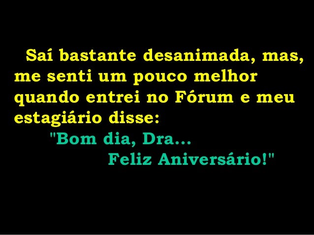 7. 7. Saí bastante desanimada, mas, me senti um pouco melhor quando entrei no Fórum e meu estagiário disse: "Bom dia, Dra... Feliz Aniversário!"