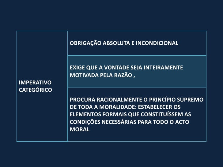 10. 10. OBRIGAÇÃO ABSOLUTA E INCONDICIONAL EXIGE QUE A VONTADE SEJA INTEIRAMENTE MOTIVADA PELA RAZÃO ,IMPERATIVOCATEGÓRICO PROCURA RACIONALMENTE O PRINCÍPIO SUPREMO DE TODA A MORALIDADE: ESTABELECER OS ELEMENTOS FORMAIS QUE CONSTITUÍSSEM AS CONDIÇÕES NECESSÁRIAS PARA TODO O ACTO MORAL