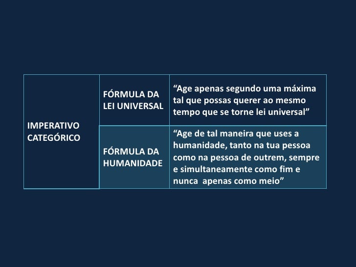 11. 11. “Age apenas segundo uma máxima FÓRMULA DA tal que possas querer ao mesmo LEI UNIVERSAL tempo que se torne lei universal”IMPERATIVOCATEGÓRICO “Age de tal maneira que uses a humanidade, tanto na tua pessoa FÓRMULA DA como na pessoa de outrem, sempre HUMANIDADE e simultaneamente como fim e nunca apenas como meio”
