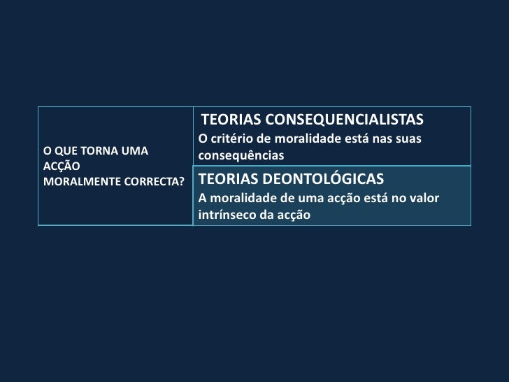 2. 2. TEORIAS CONSEQUENCIALISTAS O critério de moralidade está nas suasO QUE TORNA UMA consequênciasACÇÃOMORALMENTE CORRECTA? TEORIAS DEONTOLÓGICAS A moralidade de uma acção está no valor intrínseco da acção