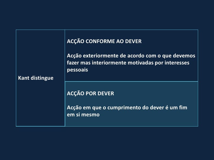 8. 8. ACÇÃO CONFORME AO DEVER Acção exteriormente de acordo com o que devemos fazer mas interiormente motivadas por interesses pessoaisKant distingue ACÇÃO POR DEVER Acção em que o cumprimento do dever é um fim em si mesmo