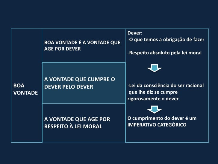 9. 9. Dever: -O que temos a obrigação de fazer BOA VONTADE É A VONTADE QUE AGE POR DEVER -Respeito absoluto pela lei moral A VONTADE QUE CUMPRE OBOA DEVER PELO DEVER -Lei da consciência do ser racionalVONTADE que lhe diz se cumpre rigorosamente o dever A VONTADE QUE AGE POR O cumprimento do dever é um RESPEITO À LEI MORAL IMPERATIVO CATEGÓRICO