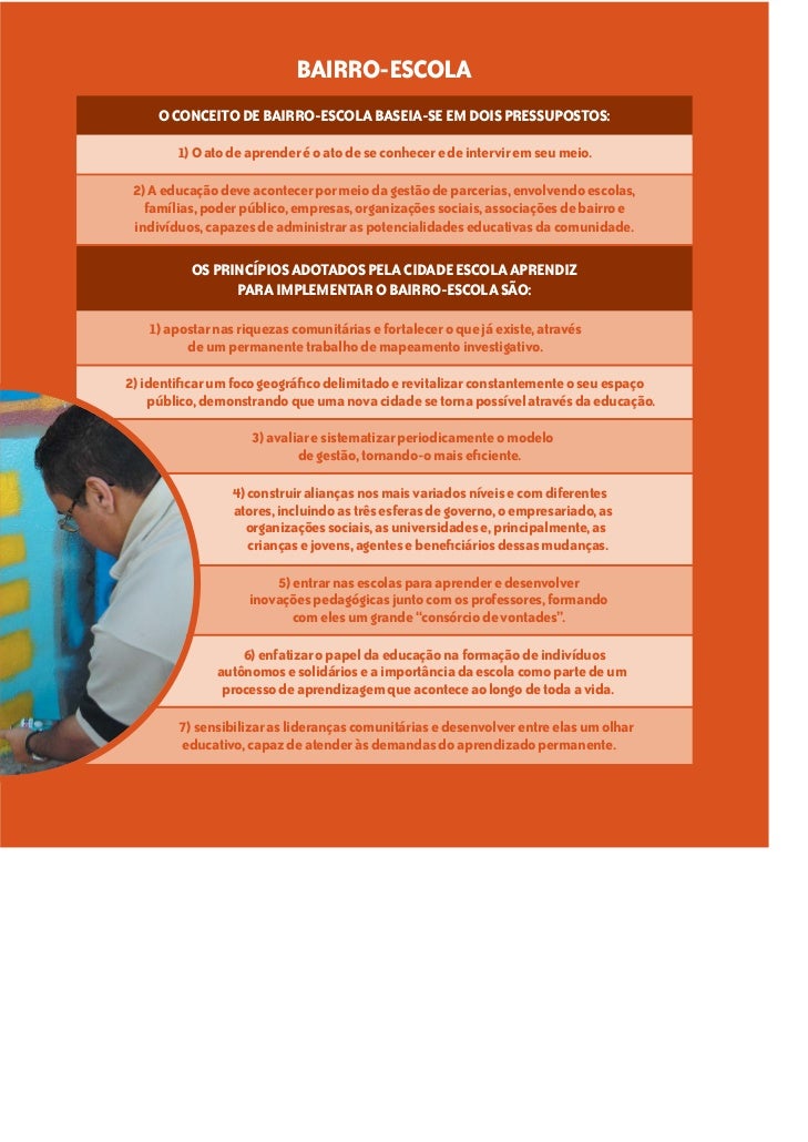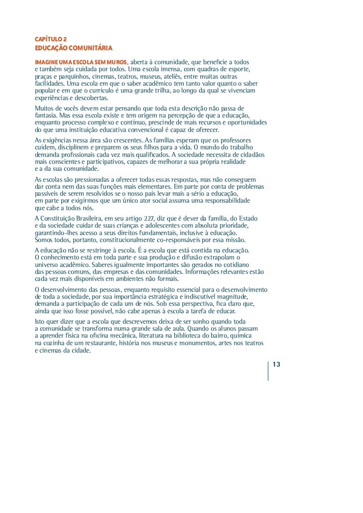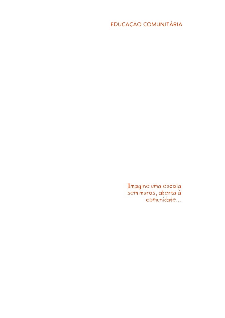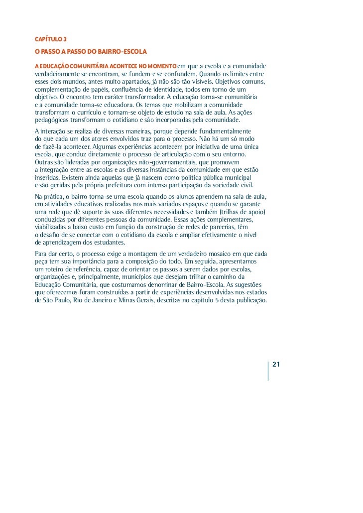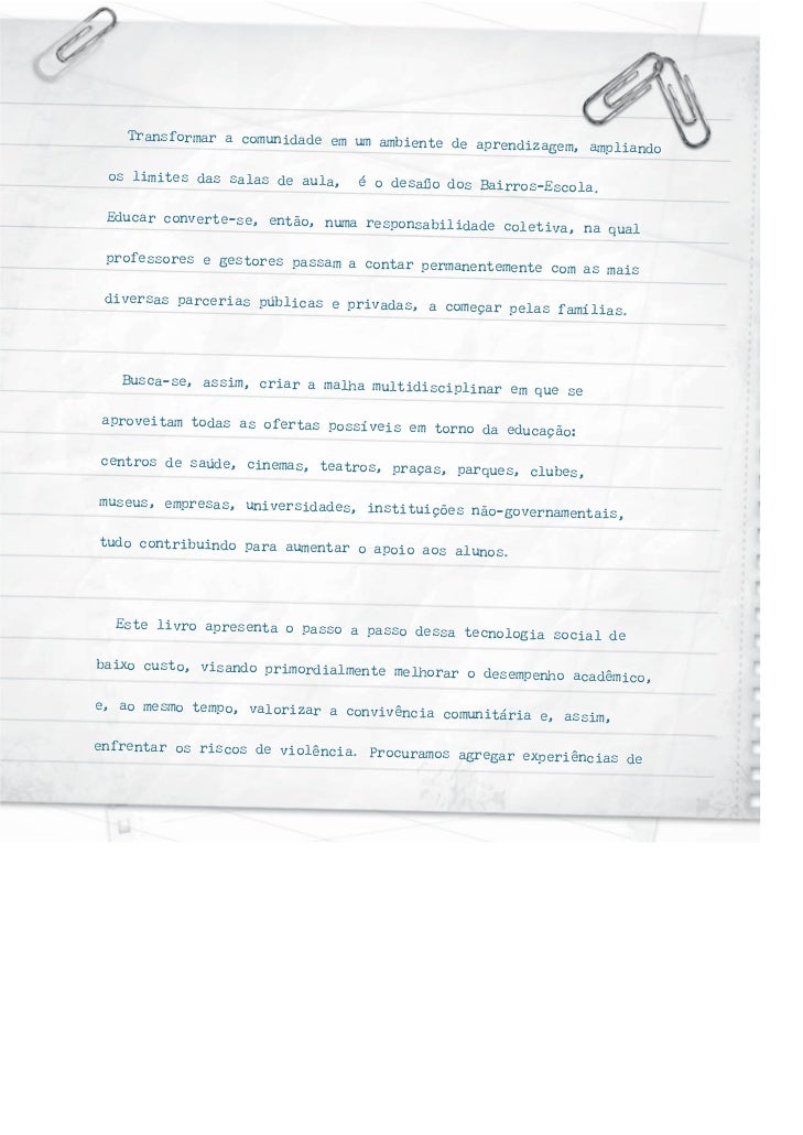 1. 1. Transformar a comunidade em um ambiente de aprendizagem, ampliando os limites das salas de aula, é o desafio dos Bairros-Escola. Educar converte-se, então, numa responsa bilidade coletiva, na qual professores e gestores passam a contar permanentemente com as mais diversas parcerias públicas e privadas , a começar pelas famílias. Busca-se, assim, criar a malha multidis ciplinar em que seaproveitam todas as ofertas possíveis em torno da educação:centros de saúde, cinemas, teatros, praç as, parques, clubes,museus, empresas, universidades, institui ções não-governamentais,tudo contribuindo para aumentar o apoi o aos alunos. Este livro apresenta o passo a passo dess a tecnologia social debaixo custo, visando primordialmente melh orar o desempenho acadêmico,e, ao mesmo tempo, valorizar a convivên cia comunitária e, assim,enfrentar os riscos de violência. Proc uramos agregar experiências de