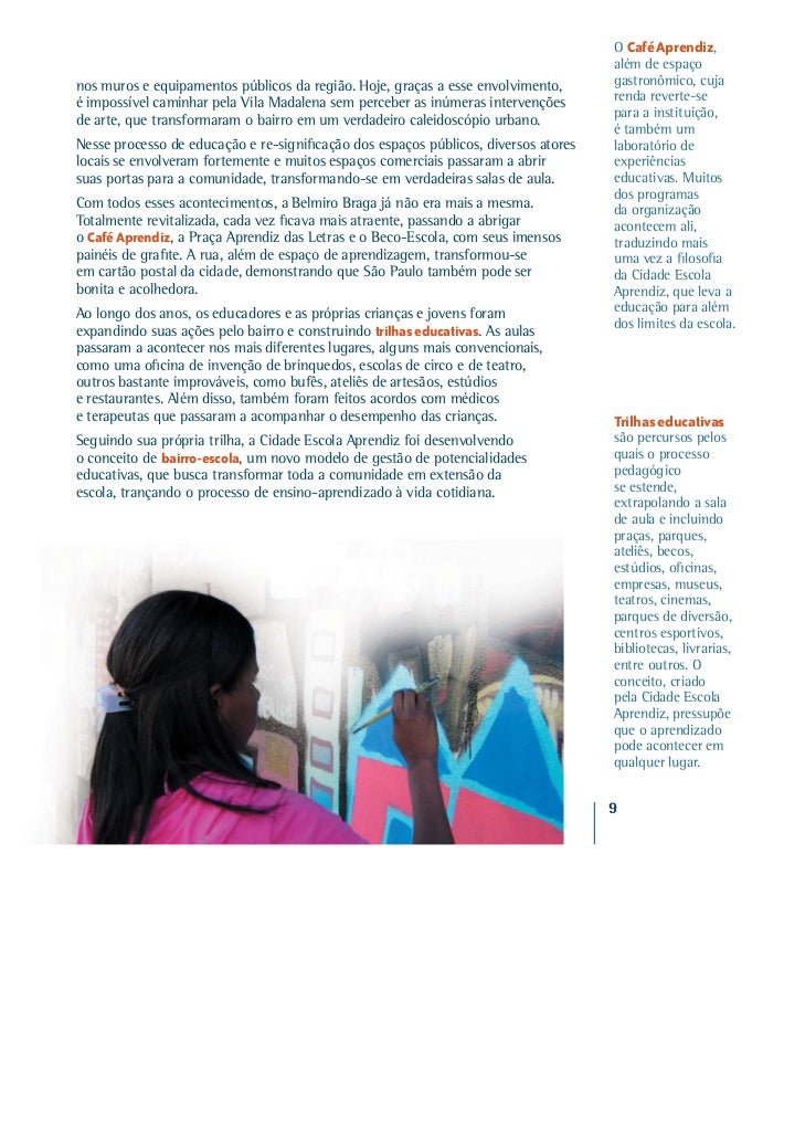 7. 7. O Café Aprendiz, além de espaçonos muros e equipamentos públicos da região. Hoje, graças a esse envolvimento, gastronômico, cujaé impossível caminhar pela Vila Madalena sem perceber as inúmeras intervenções renda reverte-sede arte, que transformaram o bairro em um verdadeiro caleidoscópio urbano. para a instituição, é também umNesse processo de educação e re-significação dos espaços públicos, diversos atores laboratório delocais se envolveram fortemente e muitos espaços comerciais passaram a abrir experiênciassuas portas para a comunidade, transformando-se em verdadeiras salas de aula. educativas. Muitos dos programasCom todos esses acontecimentos, a Belmiro Braga já não era mais a mesma. da organizaçãoTotalmente revitalizada, cada vez ficava mais atraente, passando a abrigar acontecem ali,o Café Aprendiz, a Praça Aprendiz das Letras e o Beco-Escola, com seus imensos traduzindo maispainéis de grafite. A rua, além de espaço de aprendizagem, transformou-se uma vez a filosofiaem cartão postal da cidade, demonstrando que São Paulo também pode ser da Cidade Escolabonita e acolhedora. Aprendiz, que leva aAo longo dos anos, os educadores e as próprias crianças e jovens foram educação para alémexpandindo suas ações pelo bairro e construindo trilhas educativas. As aulas dos limites da escola.passaram a acontecer nos mais diferentes lugares, alguns mais convencionais,como uma oficina de invenção de brinquedos, escolas de circo e de teatro,outros bastante improváveis, como bufês, ateliês de artesãos, estúdiose restaurantes. Além disso, também foram feitos acordos com médicose terapeutas que passaram a acompanhar o desempenho das crianças. Trilhas educativasSeguindo sua própria trilha, a Cidade Escola Aprendiz foi desenvolvendo são percursos peloso conceito de bairro-escola, um novo modelo de gestão de potencialidades quais o processoeducativas, que busca transformar toda a comunidade em extensão da pedagógicoescola, trançando o processo de ensino-aprendizado à vida cotidiana. se estende, extrapolando a sala de aula e incluindo praças, parques, ateliês, becos, estúdios, oficinas, empresas, museus, teatros, cinemas, parques de diversão, centros esportivos, bibliotecas, livrarias, entre outros. O conceito, criado pela Cidade Escola Aprendiz, pressupõe que o aprendizado pode acontecer em qualquer lugar. 9