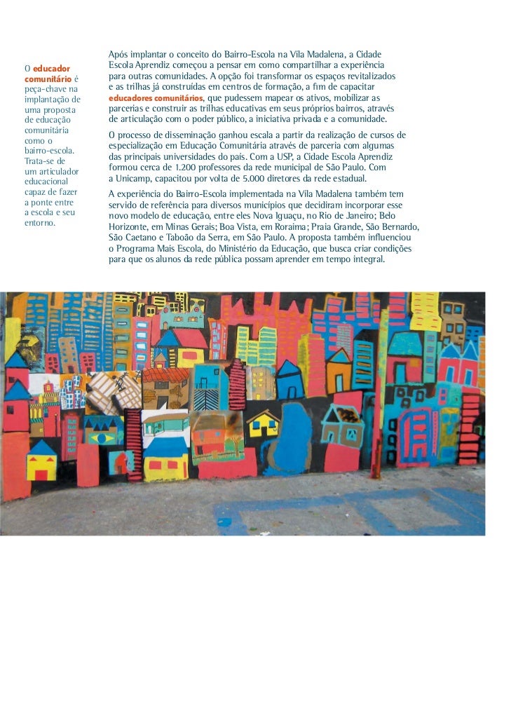 8. 8. Após implantar o conceito do Bairro-Escola na Vila Madalena, a CidadeO educador Escola Aprendiz começou a pensar em como compartilhar a experiênciacomunitário é para outras comunidades. A opção foi transformar os espaços revitalizadospeça-chave na e as trilhas já construídas em centros de formação, a fim de capacitarimplantação de educadores comunitários, que pudessem mapear os ativos, mobilizar asuma proposta parcerias e construir as trilhas educativas em seus próprios bairros, atravésde educação de articulação com o poder público, a iniciativa privada e a comunidade.comunitária O processo de disseminação ganhou escala a partir da realização de cursos decomo obairro-escola. especialização em Educação Comunitária através de parceria com algumasTrata-se de das principais universidades do país. Com a USP, a Cidade Escola Aprendizum articulador formou cerca de 1.200 professores da rede municipal de São Paulo. Comeducacional a Unicamp, capacitou por volta de 5.000 diretores da rede estadual.capaz de fazer A experiência do Bairro-Escola implementada na Vila Madalena também tema ponte entre servido de referência para diversos municípios que decidiram incorporar essea escola e seu novo modelo de educação, entre eles Nova Iguaçu, no Rio de Janeiro; Beloentorno. Horizonte, em Minas Gerais; Boa Vista, em Roraima; Praia Grande, São Bernardo, São Caetano e Taboão da Serra, em São Paulo. A proposta também influenciou o Programa Mais Escola, do Ministério da Educação, que busca criar condições para que os alunos da rede pública possam aprender em tempo integral.