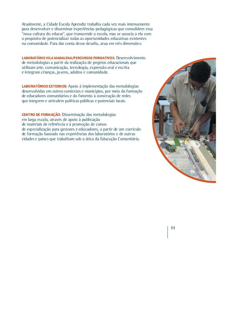 9. 9. Atualmente, a Cidade Escola Aprendiz trabalha cada vez mais intensamentepara desenvolver e disseminar experiências pedagógicas que consolidem essa“nova cultura do educar”, que transcende a escola, mas se associa a ela como propósito de potencializar todas as oportunidades educativas existentesna comunidade. Para dar conta desse desafio, atua em três dimensões:LABORATÓRIO VILA MADALENA/PERCURSOS FORMATIVOS: Desenvolvimentode metodologias a partir da realização de projetos educacionais queutilizam arte, comunicação, tecnologia, expressão oral e escritae integram crianças, jovens, adultos e comunidade.LABORATÓRIOS EXTERNOS: Apoio à implementação das metodologiasdesenvolvidas em outros contextos e municípios, por meio da formaçãode educadores comunitários e do fomento à construção de redesque integrem e articulem políticas públicas e potenciais locais.CENTRO DE FORMAÇÃO: Disseminação das metodologiasem larga escala, através de apoio à publicaçãode materiais de referência e à promoção de cursosde especialização para gestores e educadores, a partir de um currículode formação baseado nas experiências dos laboratórios e de outrascidades e países que trabalham sob a ótica da Educação Comunitária. 11