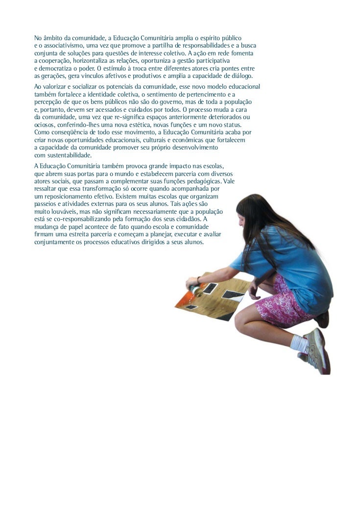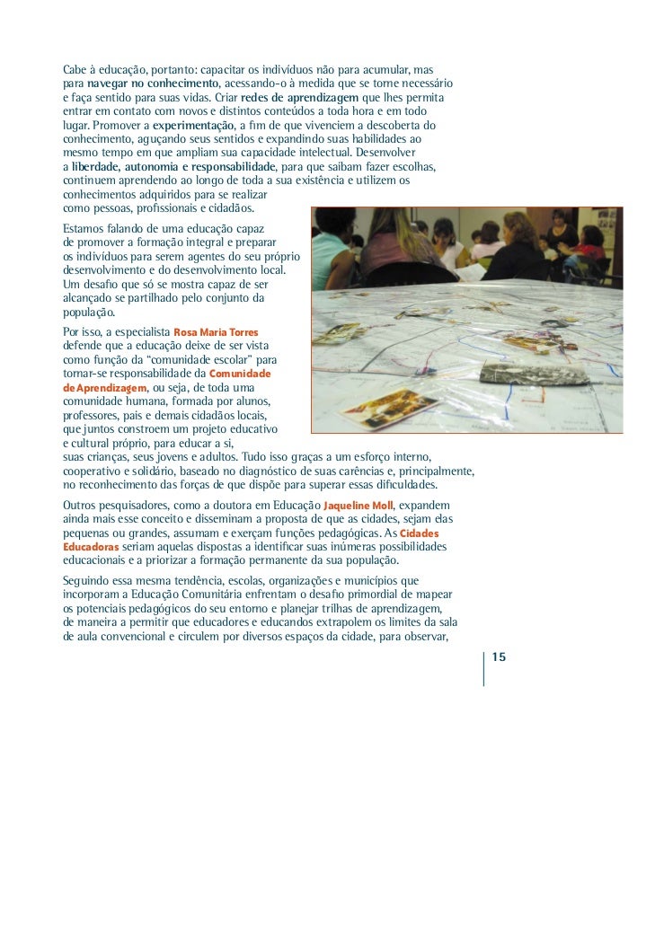 11. 11. A Educação Comunitária acontece neste momento, quando os processos formativos extrapolam o contexto escolar e tomam conta das ruas, adentrando espaços públicos, estabelecimentos comerciais, associações e centros culturais. Uma invasão consentida e planejada, articulada pela escola em estreita parceria com toda a população. Trata-se de uma nova cultura, forjada a partir desse novo olhar sobre a educação, em que a escola deixa de ser o único espaço educativo, para se tornar catalisadora e articuladora de muitas outras oportunidades de formação. Uma nova forma de pensar e fazer educação, envolvendo múltiplos espaços e atores, que se estrutura a partir do trabalho em rede, da gestão participativa e da co-responsabilização. Um projeto de cidade, que gera autonomia, cooperação e contribui para o desenvolvimento local, uma vez que fortalece simultaneamente o capital humano e o capital social, expandindo o potencial dos indivíduos ao mesmo tempo em que estreita os vínculos entre os atores locais. Entendemos por capital humano a capacidade que cada indivíduo tem de superar as adversidades e aproveitar as oportunidades com as quais se depara ao longo da sua existência. Capacidades estas principalmente associadas ao seu nível educacional e às suas condições de saúde e bem-estar. O capital social, por sua vez, diz respeito à qualidade das relações existentes entre as pessoas e as instituições que fazem parte de uma determinada comunidade. Relações baseadas na confiança, no compartilhamento e na solidariedade tendem a gerar grupos sociais mais coesos, organizados, participativos e inclusivos, ou seja, mais aptos a enfrentar seus desafios coletivos e a promover benefícios para todos os seus concidadãos. REDES DE RELAÇÕES E TEIAS DE CONHECIMENTOS O mundo mudou. Tornou-se mais complexo e exigente. Para dar conta dessas novas demandas, as pessoas se vêem obrigadas a lidar com conhecimentos e a dominar ferramentas cada vez mais sofisticadas. A escola não conseguiu acompanhar essas transformações. A defasagem é perceptível e se traduz principalmente na falta de interesse e no despreparo dos alunos. Processos educacionais que se predispuserem a entrar em sintonia com a realidade contemporânea precisam se estruturar com base em novos parâmetros. A humanidade produz um volume cada vez maior de informações impossíveis de serem retidas, mesmo porque estão em constante e rápida evolução. Filósofo francês radicado no Canadá, Pierre Lèvy acredita que, com o advento das novas tecnologias, o conhecimento deixa de ser matéria para se tornar uma rede de vasos comunicantes e interativos. Essa nova dinâmica reforça a importância de se aprender a “navegar” e não a “estocar” informações. A navegação como processo de aprendizagem rompe a linearidade, favorece a atitude exploratória e lúdica e torna o conhecer uma aventura prazerosa, marcada pela cooperação e pela inteligência coletiva.14