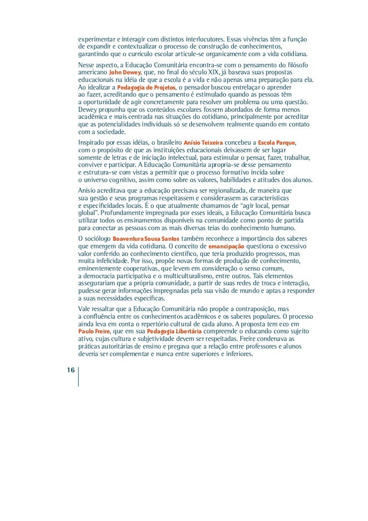 13. 13. experimentar e interagir com distintos interlocutores. Essas vivências têm a função de expandir e contextualizar o processo de construção de conhecimentos, garantindo que o currículo escolar articule-se organicamente com a vida cotidiana. Nesse aspecto, a Educação Comunitária encontra-se com o pensamento do filósofo americano John Dewey, que, no final do século XIX, já baseava suas propostas educacionais na idéia de que a escola é a vida e não apenas uma preparação para ela. Ao idealizar a Pedagogia de Projetos, o pensador buscou entrelaçar o aprender ao fazer, acreditando que o pensamento é estimulado quando as pessoas têm a oportunidade de agir concretamente para resolver um problema ou uma questão. Dewey propunha que os conteúdos escolares fossem abordados de forma menos acadêmica e mais centrada nas situações do cotidiano, principalmente por acreditar que as potencialidades individuais só se desenvolvem realmente quando em contato com a sociedade. Inspirado por essas idéias, o brasileiro Anísio Teixeira concebeu a Escola Parque, com o propósito de que as instituições educacionais deixassem de ser lugar somente de letras e de iniciação intelectual, para estimular o pensar, fazer, trabalhar, conviver e participar. A Educação Comunitária apropria-se desse pensamento e estrutura-se com vistas a permitir que o processo formativo incida sobre o universo cognitivo, assim como sobre os valores, habilidades e atitudes dos alunos. Anísio acreditava que a educação precisava ser regionalizada, de maneira que sua gestão e seus programas respeitassem e considerassem as características e especificidades locais. É o que atualmente chamamos de “agir local, pensar global”. Profundamente impregnada por esses ideais, a Educação Comunitária busca utilizar todos os ensinamentos disponíveis na comunidade como ponto de partida para conectar as pessoas com as mais diversas teias do conhecimento humano. O sociólogo Boaventura Sousa Santos também reconhece a importância dos saberes que emergem da vida cotidiana. O conceito de emancipação questiona o excessivo valor conferido ao conhecimento científico, que teria produzido progressos, mas muita infelicidade. Por isso, propõe novas formas de produção de conhecimento, eminentemente cooperativas, que levem em consideração o senso comum, a democracia participativa e o multiculturalismo, entre outros. Tais elementos assegurariam que a própria comunidade, a partir de suas redes de troca e interação, pudesse gerar informações impregnadas pela sua visão de mundo e aptas a responder a suas necessidades específicas. Vale ressaltar que a Educação Comunitária não propõe a contraposição, mas a confluência entre os conhecimentos acadêmicos e os saberes populares. O processo ainda leva em conta o repertório cultural de cada aluno. A proposta tem eco em Paulo Freire, que em sua Pedagogia Libertária compreende o educando como sujeito ativo, cujas cultura e subjetividade devem ser respeitadas. Freire condenava as práticas autoritárias de ensino e pregava que a relação entre professores e alunos deveria ser complementar e nunca entre superiores e inferiores.16
