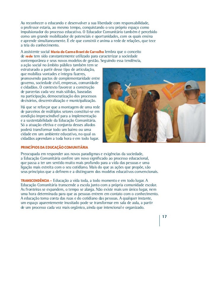 14. 14. Ao reconhecer o educando e desenvolver a sua liberdade com responsabilidade,o professor estaria, ao mesmo tempo, conquistando o seu próprio espaço comoimpulsionador do processo educativo. O Educador Comunitário também é percebidocomo um grande mobilizador de potenciais e oportunidades, com os quais ensinae aprende simultaneamente. É ele que constrói e anima a rede de relações, que tecea teia do conhecimento.A assistente social Maria do Carmo Brant de Carvalho lembra que o conceitode rede tem sido constantemente utilizado para caracterizar a sociedadecontemporânea e seus novos modelos de gestão. Seguindo essa tendência,a ação social no âmbito público também tem seestruturado a partir desse tipo de articulação,que mobiliza vontades e integra fazeres,promovendo pactos de complementaridade entregoverno, sociedade civil, empresas, comunidadee cidadãos. O contexto favorece a construçãode parcerias cada vez mais sólidas, baseadasna participação, democratização dos processosdecisórios, descentralização e municipalização.Há que se reforçar que a montagem de uma redede parceiros de múltiplos setores constitui-se emcondição imprescindível para a implementaçãoe a sustentabilidade da Educação Comunitária.Só a atuação efetiva e conjunta desses aliadospoderá transformar todo um bairro ou umacidade em um ambiente educativo, no qual oscidadãos aprendam a toda hora e em todo lugar.PRINCÍPIOS DA EDUCAÇÃO COMUNITÁRIAPreocupada em responder aos novos paradigmas e exigências da sociedade,a Educação Comunitária confere um novo significado ao processo educacional,que passa a ter um sentido muito mais profundo para a vida das pessoas e umaligação mais estreita com o seu cotidiano. Mais do que as ações que propõe, sãoseus princípios que a definem e a distinguem dos modelos educativos convencionais.TRANSCENDÊNCIA – Educação a vida toda, a todo momento e em todo lugar. AEducação Comunitária transcende a escola junto com a própria comunidade escolar.As fronteiras se expandem, o tempo se alarga. Não existe mais um único lugar, nemuma hora determinada para que as pessoas entrem em contato com o conhecimento.A educação toma conta das ruas e do cotidiano das pessoas. A qualquer instante,um espaço aparentemente inusitado pode se transformar em sala de aula, a partirde um processo cada vez mais orgânico, ainda que intencional e organizado. 17
