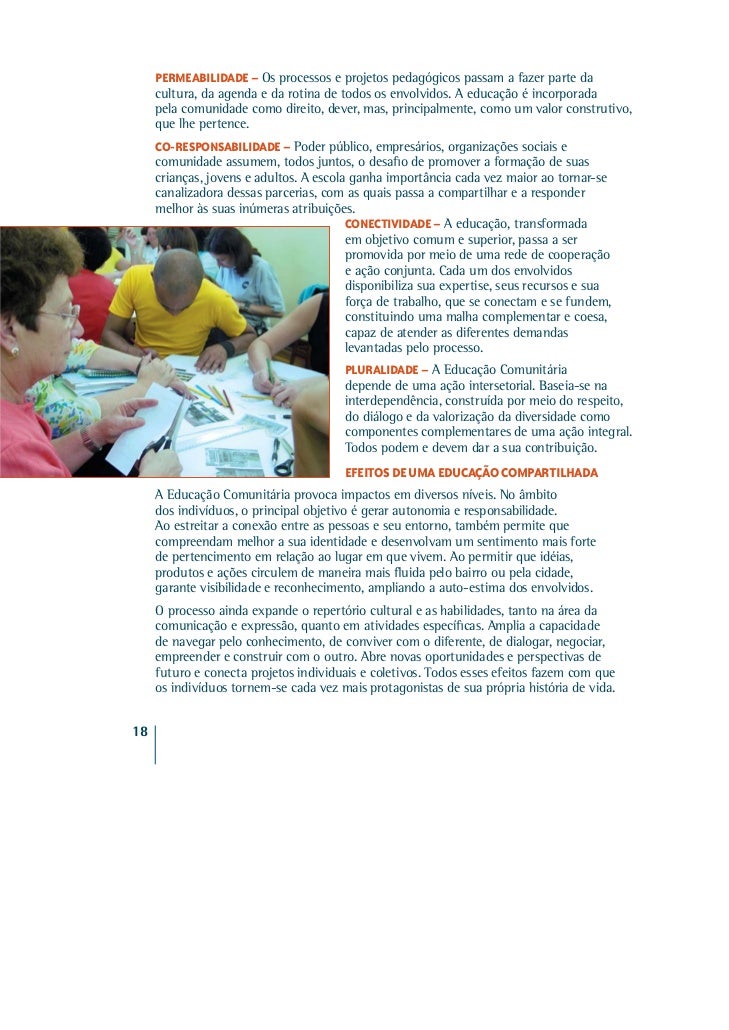 15. 15. PERMEABILIDADE – Os processos e projetos pedagógicos passam a fazer parte da cultura, da agenda e da rotina de todos os envolvidos. A educação é incorporada pela comunidade como direito, dever, mas, principalmente, como um valor construtivo, que lhe pertence. CO-RESPONSABILIDADE – Poder público, empresários, organizações sociais e comunidade assumem, todos juntos, o desafio de promover a formação de suas crianças, jovens e adultos. A escola ganha importância cada vez maior ao tornar-se canalizadora dessas parcerias, com as quais passa a compartilhar e a responder melhor às suas inúmeras atribuições. CONECTIVIDADE – A educação, transformada em objetivo comum e superior, passa a ser promovida por meio de uma rede de cooperação e ação conjunta. Cada um dos envolvidos disponibiliza sua expertise, seus recursos e sua força de trabalho, que se conectam e se fundem, constituindo uma malha complementar e coesa, capaz de atender as diferentes demandas levantadas pelo processo. PLURALIDADE – A Educação Comunitária depende de uma ação intersetorial. Baseia-se na interdependência, construída por meio do respeito, do diálogo e da valorização da diversidade como componentes complementares de uma ação integral. Todos podem e devem dar a sua contribuição. EFEITOS DE UMA EDUCAÇÃO COMPARTILHADA A Educação Comunitária provoca impactos em diversos níveis. No âmbito dos indivíduos, o principal objetivo é gerar autonomia e responsabilidade. Ao estreitar a conexão entre as pessoas e seu entorno, também permite que compreendam melhor a sua identidade e desenvolvam um sentimento mais forte de pertencimento em relação ao lugar em que vivem. Ao permitir que idéias, produtos e ações circulem de maneira mais fluida pelo bairro ou pela cidade, garante visibilidade e reconhecimento, ampliando a auto-estima dos envolvidos. O processo ainda expande o repertório cultural e as habilidades, tanto na área da comunicação e expressão, quanto em atividades específicas. Amplia a capacidade de navegar pelo conhecimento, de conviver com o diferente, de dialogar, negociar, empreender e construir com o outro. Abre novas oportunidades e perspectivas de futuro e conecta projetos individuais e coletivos. Todos esses efeitos fazem com que os indivíduos tornem-se cada vez mais protagonistas de sua própria história de vida.18