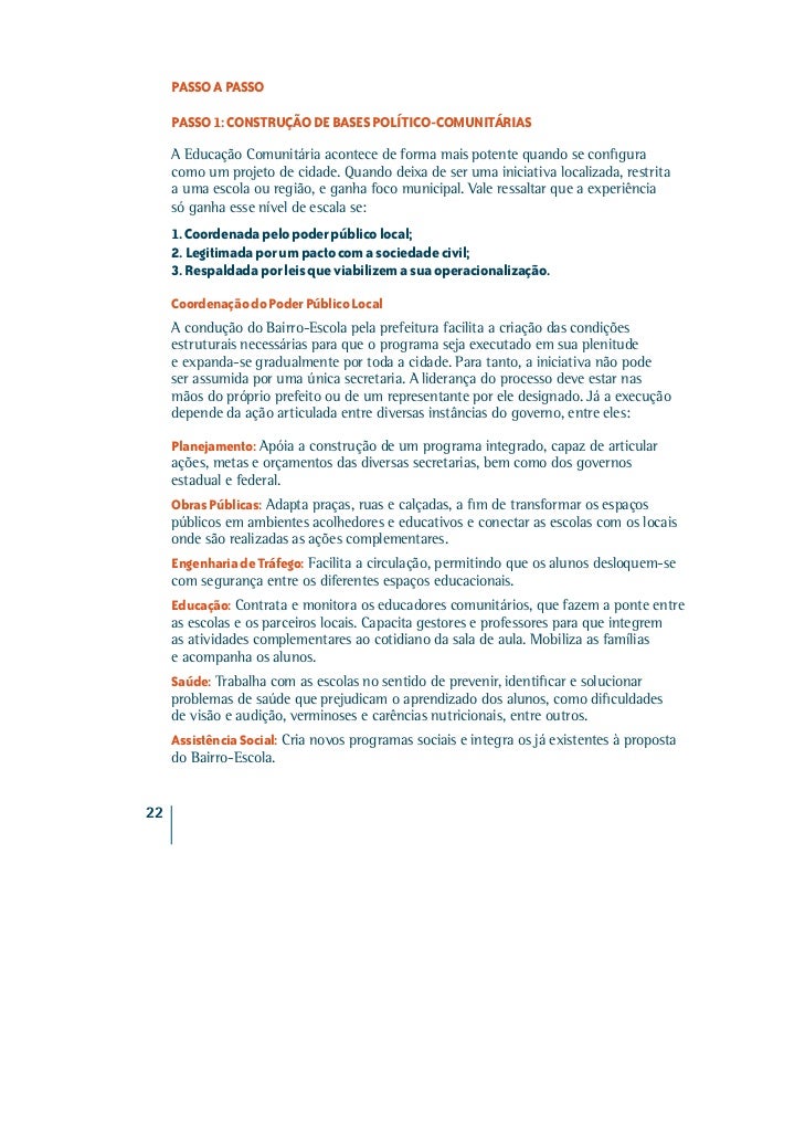 18. 18. PASSO A PASSO PASSO 1: CONSTRUÇÃO DE BASES POLÍTICO-COMUNITÁRIAS A Educação Comunitária acontece de forma mais potente quando se configura como um projeto de cidade. Quando deixa de ser uma iniciativa localizada, restrita a uma escola ou região, e ganha foco municipal. Vale ressaltar que a experiência só ganha esse nível de escala se: 1. Coordenada pelo poder público local; 2. Legitimada por um pacto com a sociedade civil; 3. Respaldada por leis que viabilizem a sua operacionalização. Coordenação do Poder Público Local A condução do Bairro-Escola pela prefeitura facilita a criação das condições estruturais necessárias para que o programa seja executado em sua plenitude e expanda-se gradualmente por toda a cidade. Para tanto, a iniciativa não pode ser assumida por uma única secretaria. A liderança do processo deve estar nas mãos do próprio prefeito ou de um representante por ele designado. Já a execução depende da ação articulada entre diversas instâncias do governo, entre eles: Planejamento: Apóia a construção de um programa integrado, capaz de articular ações, metas e orçamentos das diversas secretarias, bem como dos governos estadual e federal. Obras Públicas: Adapta praças, ruas e calçadas, a fim de transformar os espaços públicos em ambientes acolhedores e educativos e conectar as escolas com os locais onde são realizadas as ações complementares. Engenharia de Tráfego: Facilita a circulação, permitindo que os alunos desloquem-se com segurança entre os diferentes espaços educacionais. Educação: Contrata e monitora os educadores comunitários, que fazem a ponte entre as escolas e os parceiros locais. Capacita gestores e professores para que integrem as atividades complementares ao cotidiano da sala de aula. Mobiliza as famílias e acompanha os alunos. Saúde: Trabalha com as escolas no sentido de prevenir, identificar e solucionar problemas de saúde que prejudicam o aprendizado dos alunos, como dificuldades de visão e audição, verminoses e carências nutricionais, entre outros. Assistência Social: Cria novos programas sociais e integra os já existentes à proposta do Bairro-Escola.22