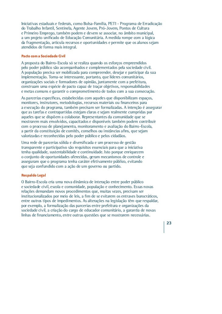 19. 19. Iniciativas estaduais e federais, como Bolsa-Família, PETI - Programa de Erradicaçãodo Trabalho Infantil, Sentinela, Agente Jovem, Pró-Jovem, Pontos de Culturae Primeiro Emprego, também podem e devem se associar, no âmbito municipal,a um projeto unificado de Educação Comunitária. A medida rompe com a lógicada fragmentação, articula recursos e oportunidades e permite que os alunos sejamatendidos de forma mais integral.Pacto com a Sociedade CivilA proposta do Bairro-Escola só se realiza quando os esforços empreendidospelo poder público são acompanhados e complementados pela sociedade civil.A população precisa ser mobilizada para compreender, desejar e participar da suaimplementação. Torna-se interessante, portanto, que líderes comunitários,organizações sociais e formadores de opinião, juntamente com a prefeitura,construam uma espécie de pacto capaz de traçar objetivos, responsabilidadese metas comuns e garantir o comprometimento de todos com a sua consecução.As parcerias específicas, estabelecidas com aqueles que disponibilizam espaços,monitores, instrutores, metodologias, recursos materiais ou financeiros paraa execução do programa, também precisam ser formalizadas. A intenção é assegurarque as tarefas e contrapartidas estejam claras e sejam realmente cumpridas poraqueles que se dispõem a colaborar. Representantes da comunidade que semostrarem mais envolvidos, capacitados e disponíveis também podem contribuircom o processo de planejamento, monitoramento e avaliação do Bairro-Escola,a partir da constituição de comitês, conselhos ou instâncias afins, que sejamvalorizadas e reconhecidas pelo poder público e pelos cidadãos.Uma rede de parcerias sólida e diversificada e um processo de gestãotransparente e participativo são requisitos essenciais para que a iniciativatenha qualidade, sustentabilidade e continuidade. Isto porque enriquecemo conjunto de oportunidades oferecidas, geram mecanismos de controle easseguram que o programa tenha caráter efetivamente público, evitandoque seja confundido com a ação de um governo ou partido.Respaldo LegalO Bairro-Escola cria uma nova dinâmica de interação entre poder públicoe sociedade civil, escola e comunidade, população e conhecimento. Essas novasrelações demandam novos procedimentos que, muitas vezes, precisam serinstitucionalizados por meio de leis, a fim de se evitarem os entraves burocráticos,entre outros tipos de impedimentos. As alterações na legislação têm que respaldar,por exemplo, a formalização das parcerias entre prefeitura e organizações dasociedade civil, a criação do cargo de educador comunitário, a garantia de novaslinhas de financiamento, entre outras questões que se mostrarem necessárias. 23