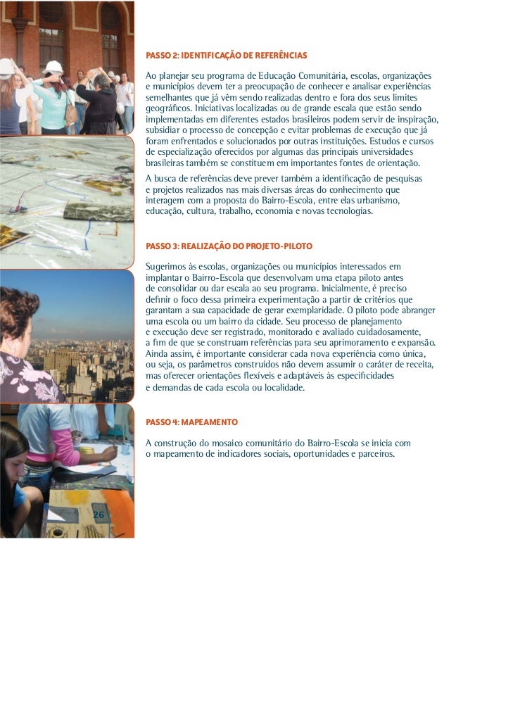 20. 20. PASSO 2: IDENTIFICAÇÃO DE REFERÊNCIAS Ao planejar seu programa de Educação Comunitária, escolas, organizações e municípios devem ter a preocupação de conhecer e analisar experiências semelhantes que já vêm sendo realizadas dentro e fora dos seus limites geográficos. Iniciativas localizadas ou de grande escala que estão sendo implementadas em diferentes estados brasileiros podem servir de inspiração, subsidiar o processo de concepção e evitar problemas de execução que já foram enfrentados e solucionados por outras instituições. Estudos e cursos de especialização oferecidos por algumas das principais universidades brasileiras também se constituem em importantes fontes de orientação. A busca de referências deve prever também a identificação de pesquisas e projetos realizados nas mais diversas áreas do conhecimento que interagem com a proposta do Bairro-Escola, entre elas urbanismo, educação, cultura, trabalho, economia e novas tecnologias. PASSO 3: REALIZAÇÃO DO PROJETO-PILOTO Sugerimos às escolas, organizações ou municípios interessados em implantar o Bairro-Escola que desenvolvam uma etapa piloto antes de consolidar ou dar escala ao seu programa. Inicialmente, é preciso definir o foco dessa primeira experimentação a partir de critérios que garantam a sua capacidade de gerar exemplaridade. O piloto pode abranger uma escola ou um bairro da cidade. Seu processo de planejamento e execução deve ser registrado, monitorado e avaliado cuidadosamente, a fim de que se construam referências para seu aprimoramento e expansão. Ainda assim, é importante considerar cada nova experiência como única, ou seja, os parâmetros construídos não devem assumir o caráter de receita, mas oferecer orientações flexíveis e adaptáveis às especificidades e demandas de cada escola ou localidade. PASSO 4: MAPEAMENTO A construção do mosaico comunitário do Bairro-Escola se inicia com o mapeamento de indicadores sociais, oportunidades e parceiros.26