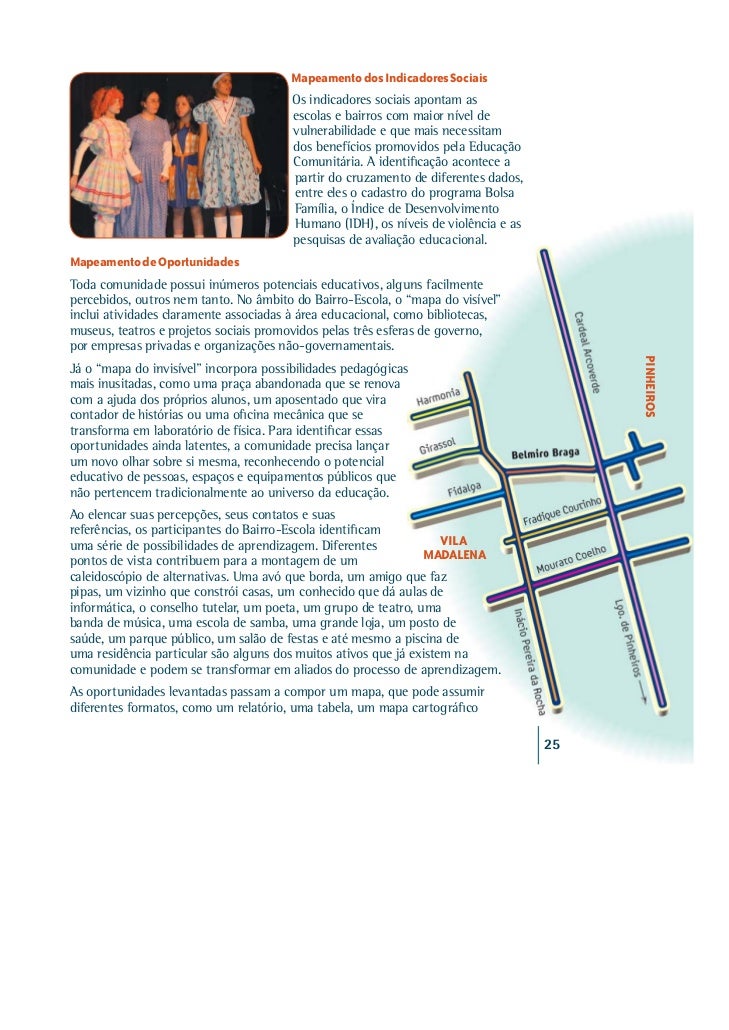 21. 21. Mapeamento dos Indicadores Sociais Os indicadores sociais apontam as escolas e bairros com maior nível de vulnerabilidade e que mais necessitam dos benefícios promovidos pela Educação Comunitária. A identificação acontece aa partir do cruzamento de diferentes dados, entre eles o cadastro do programa Bolsa Família, o Índice de Desenvolvimento Humano (IDH), os níveis de violência e as pesquisas de avaliação educacional.Mapeamento de OportunidadesToda comunidade possui inúmeros potenciais educativos, alguns facilmentepercebidos, outros nem tanto. No âmbito do Bairro-Escola, o “mapa do visível”inclui atividades claramente associadas à área educacional, como bibliotecas,museus, teatros e projetos sociais promovidos pelas três esferas de governo,por empresas privadas e organizações não-governamentais. PINHEIROSJá o “mapa do invisível” incorpora possibilidades pedagógicasmais inusitadas, como uma praça abandonada que se renovacom a ajuda dos próprios alunos, um aposentado que viracontador de histórias ou uma oficina mecânica que setransforma em laboratório de física. Para identificar essasoportunidades ainda latentes, a comunidade precisa lançarum novo olhar sobre si mesma, reconhecendo o potencialeducativo de pessoas, espaços e equipamentos públicos quenão pertencem tradicionalmente ao universo da educação.Ao elencar suas percepções, seus contatos e suasreferências, os participantes do Bairro-Escola identificamuma série de possibilidades de aprendizagem. Diferentes VILApontos de vista contribuem para a montagem de um MADALENAcaleidoscópio de alternativas. Uma avó que borda, um amigo que fazpipas, um vizinho que constrói casas, um conhecido que dá aulas deinformática, o conselho tutelar, um poeta, um grupo de teatro, umabanda de música, uma escola de samba, uma grande loja, um posto desaúde, um parque público, um salão de festas e até mesmo a piscina deuma residência particular são alguns dos muitos ativos que já existem nacomunidade e podem se transformar em aliados do processo de aprendizagem.As oportunidades levantadas passam a compor um mapa, que pode assumirdiferentes formatos, como um relatório, uma tabela, um mapa cartográfico 25