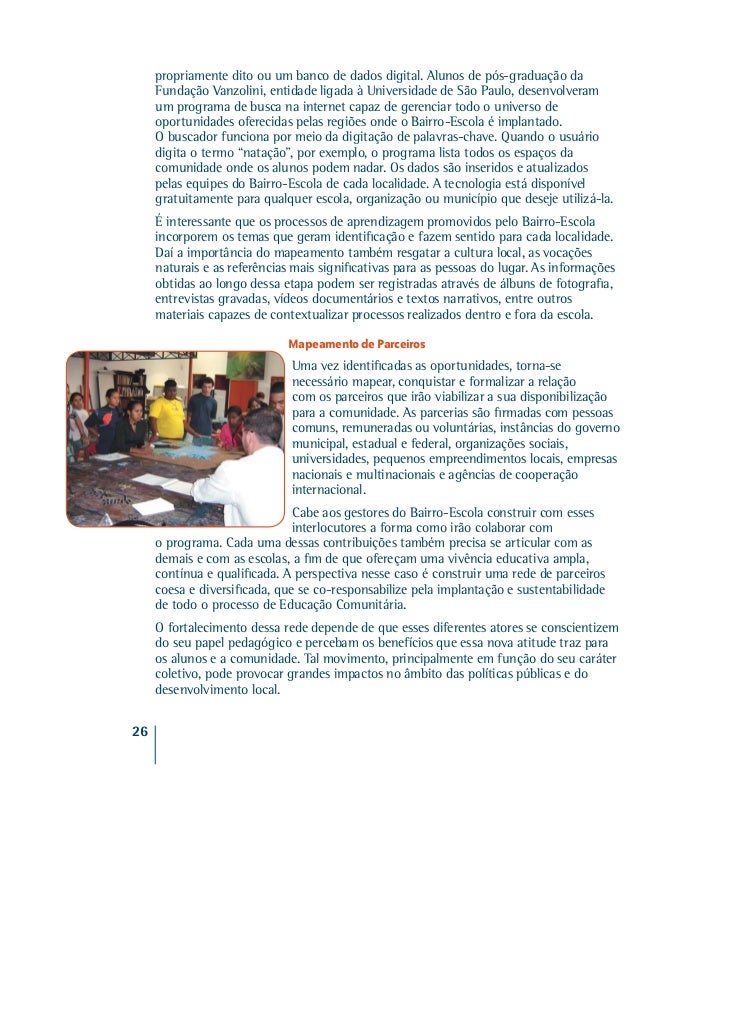 22. 22. propriamente dito ou um banco de dados digital. Alunos de pós-graduação da Fundação Vanzolini, entidade ligada à Universidade de São Paulo, desenvolveram um programa de busca na internet capaz de gerenciar todo o universo de oportunidades oferecidas pelas regiões onde o Bairro-Escola é implantado. O buscador funciona por meio da digitação de palavras-chave. Quando o usuário digita o termo “natação”, por exemplo, o programa lista todos os espaços da comunidade onde os alunos podem nadar. Os dados são inseridos e atualizados pelas equipes do Bairro-Escola de cada localidade. A tecnologia está disponível gratuitamente para qualquer escola, organização ou município que deseje utilizá-la. É interessante que os processos de aprendizagem promovidos pelo Bairro-Escola incorporem os temas que geram identificação e fazem sentido para cada localidade. Daí a importância do mapeamento também resgatar a cultura local, as vocações naturais e as referências mais significativas para as pessoas do lugar. As informações obtidas ao longo dessa etapa podem ser registradas através de álbuns de fotografia, entrevistas gravadas, vídeos documentários e textos narrativos, entre outros materiais capazes de contextualizar processos realizados dentro e fora da escola. Mapeamento de Parceiros Uma vez identificadas as oportunidades, torna-se necessário mapear, conquistar e formalizar a relação com os parceiros que irão viabilizar a sua disponibilização para a comunidade. As parcerias são firmadas com pessoas comuns, remuneradas ou voluntárias, instâncias do governo municipal, estadual e federal, organizações sociais, universidades, pequenos empreendimentos locais, empresas nacionais e multinacionais e agências de cooperação internacional. Cabe aos gestores do Bairro-Escola construir com esses interlocutores a forma como irão colaborar com o programa. Cada uma dessas contribuições também precisa se articular com as demais e com as escolas, a fim de que ofereçam uma vivência educativa ampla, contínua e qualificada. A perspectiva nesse caso é construir uma rede de parceiros coesa e diversificada, que se co-responsabilize pela implantação e sustentabilidade de todo o processo de Educação Comunitária. O fortalecimento dessa rede depende de que esses diferentes atores se conscientizem do seu papel pedagógico e percebam os benefícios que essa nova atitude traz para os alunos e a comunidade. Tal movimento, principalmente em função do seu caráter coletivo, pode provocar grandes impactos no âmbito das políticas públicas e do desenvolvimento local.26