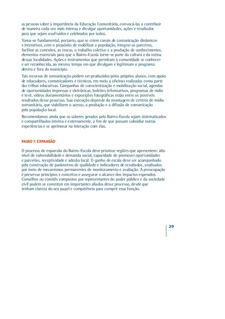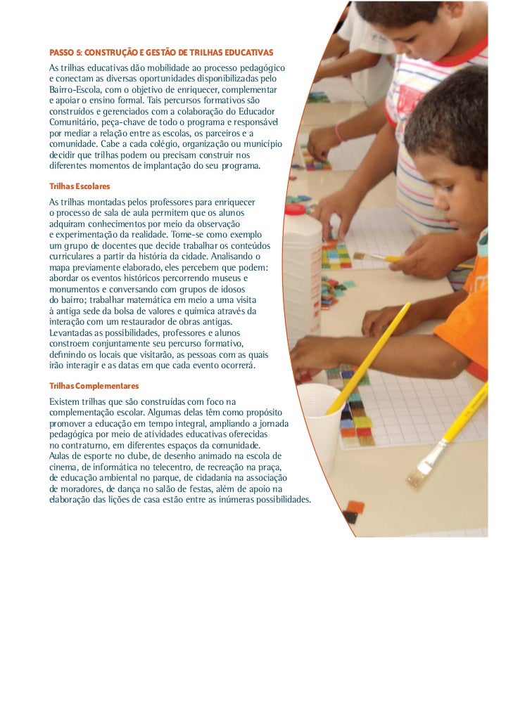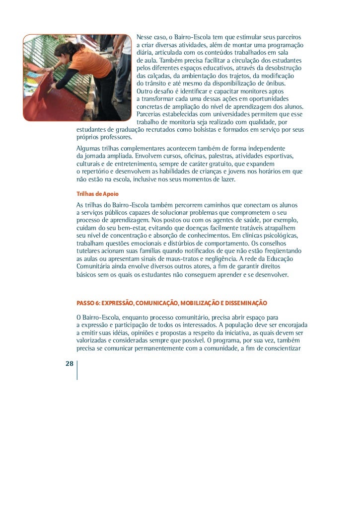 24. 24. Nesse caso, o Bairro-Escola tem que estimular seus parceiros a criar diversas atividades, além de montar uma programação diária, articulada com os conteúdos trabalhados em sala de aula. Também precisa facilitar a circulação dos estudantes pelos diferentes espaços educativos, através da desobstrução das calçadas, da ambientação dos trajetos, da modificação do trânsito e até mesmo da disponibilização de ônibus. Outro desafio é identificar e capacitar monitores aptos a transformar cada uma dessas ações em oportunidades concretas de ampliação do nível de aprendizagem dos alunos. Parcerias estabelecidas com universidades permitem que esse trabalho de monitoria seja realizado com qualidade, por estudantes de graduação recrutados como bolsistas e formados em serviço por seus próprios professores. Algumas trilhas complementares acontecem também de forma independente da jornada ampliada. Envolvem cursos, oficinas, palestras, atividades esportivas, culturais e de entretenimento, sempre de caráter gratuito, que expandem o repertório e desenvolvem as habilidades de crianças e jovens nos horários em que não estão na escola, inclusive nos seus momentos de lazer. Trilhas de Apoio As trilhas do Bairro-Escola também percorrem caminhos que conectam os alunos a serviços públicos capazes de solucionar problemas que comprometem o seu processo de aprendizagem. Nos postos ou com os agentes de saúde, por exemplo, cuidam do seu bem-estar, evitando que doenças facilmente tratáveis atrapalhem seu nível de concentração e absorção de conhecimentos. Em clínicas psicológicas, trabalham questões emocionais e distúrbios de comportamento. Os conselhos tutelares acionam suas famílias quando notificados de que não estão freqüentando as aulas ou apresentam sinais de maus-tratos e negligência. A rede da Educação Comunitária ainda envolve diversos outros atores, a fim de garantir direitos básicos sem os quais os estudantes não conseguem aprender e se desenvolver. PASSO 6: EXPRESSÃO, COMUNICAÇÃO, MOBILIZAÇÃO E DISSEMINAÇÃO O Bairro-Escola, enquanto processo comunitário, precisa abrir espaço para a expressão e participação de todos os interessados. A população deve ser encorajada a emitir suas idéias, opiniões e propostas a respeito da iniciativa, as quais devem ser valorizadas e consideradas sempre que possível. O programa, por sua vez, também precisa se comunicar permanentemente com a comunidade, a fim de conscientizar28