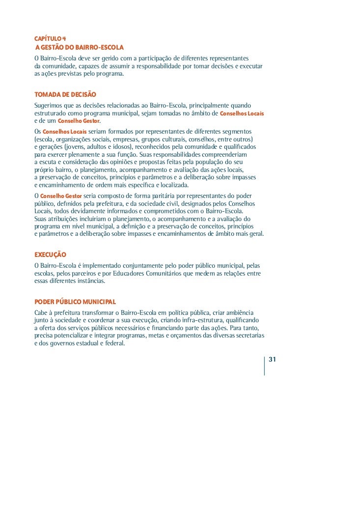 26. 26. CAPÍTULO 4A GESTÃO DO BAIRRO-ESCOLAO Bairro-Escola deve ser gerido com a participação de diferentes representantesda comunidade, capazes de assumir a responsabilidade por tomar decisões e executaras ações previstas pelo programa.TOMADA DE DECISÃOSugerimos que as decisões relacionadas ao Bairro-Escola, principalmente quandoestruturado como programa municipal, sejam tomadas no âmbito de Conselhos Locaise de um Conselho Gestor.Os Conselhos Locais seriam formados por representantes de diferentes segmentos(escola, organizações sociais, empresas, grupos culturais, conselhos, entre outros)e gerações (jovens, adultos e idosos), reconhecidos pela comunidade e qualificadospara exercer plenamente a sua função. Suas responsabilidades compreenderiama escuta e consideração das opiniões e propostas feitas pela população do seupróprio bairro, o planejamento, acompanhamento e avaliação das ações locais,a preservação de conceitos, princípios e parâmetros e a deliberação sobre impassese encaminhamento de ordem mais específica e localizada.O Conselho Gestor seria composto de forma paritária por representantes do poderpúblico, definidos pela prefeitura, e da sociedade civil, designados pelos ConselhosLocais, todos devidamente informados e comprometidos com o Bairro-Escola.Suas atribuições incluiriam o planejamento, o acompanhamento e a avaliação doprograma em nível municipal, a definição e a preservação de conceitos, princípiose parâmetros e a deliberação sobre impasses e encaminhamentos de âmbito mais geral.EXECUÇÃOO Bairro-Escola é implementado conjuntamente pelo poder público municipal, pelasescolas, pelos parceiros e por Educadores Comunitários que medem as relações entreessas diferentes instâncias.PODER PÚBLICO MUNICIPALCabe à prefeitura transformar o Bairro-Escola em política pública, criar ambiênciajunto à sociedade e coordenar a sua execução, criando infra-estrutura, qualificandoa oferta dos serviços públicos necessários e financiando parte das ações. Para tanto,precisa potencializar e integrar programas, metas e orçamentos das diversas secretariase dos governos estadual e federal. 31