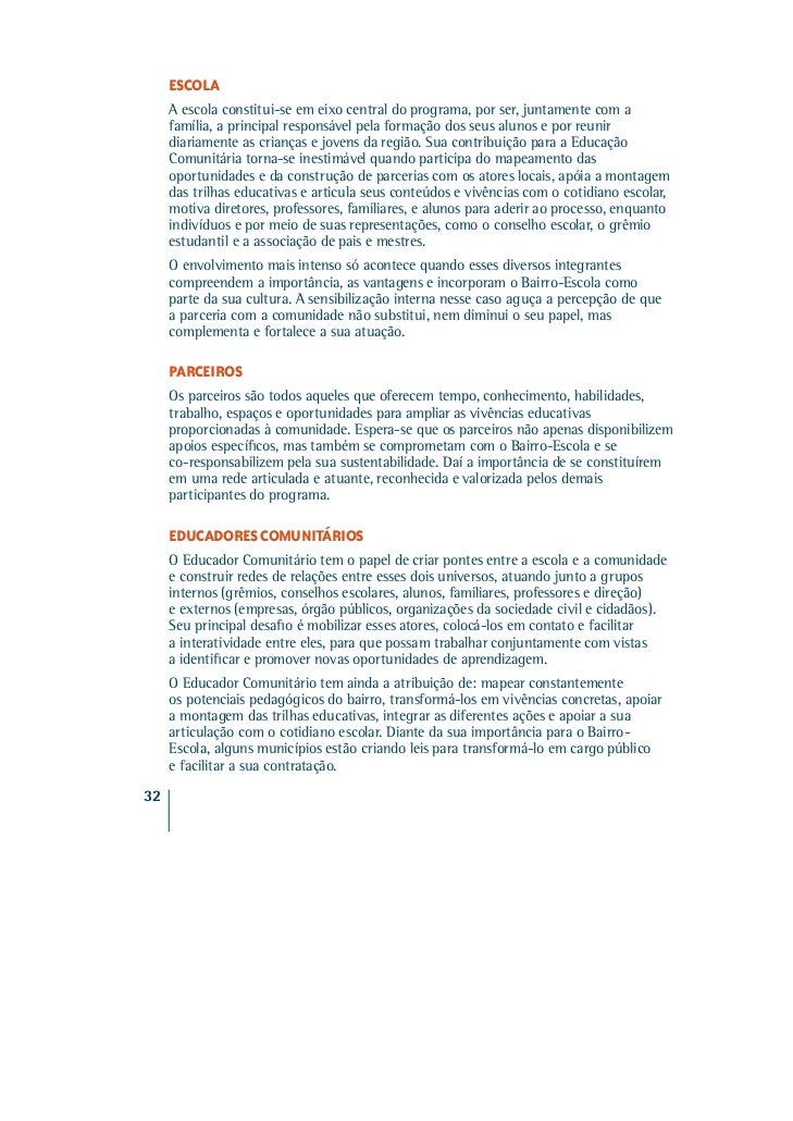 27. 27. ESCOLA A escola constitui-se em eixo central do programa, por ser, juntamente com a família, a principal responsável pela formação dos seus alunos e por reunir diariamente as crianças e jovens da região. Sua contribuição para a Educação Comunitária torna-se inestimável quando participa do mapeamento das oportunidades e da construção de parcerias com os atores locais, apóia a montagem das trilhas educativas e articula seus conteúdos e vivências com o cotidiano escolar, motiva diretores, professores, familiares, e alunos para aderir ao processo, enquanto indivíduos e por meio de suas representações, como o conselho escolar, o grêmio estudantil e a associação de pais e mestres. O envolvimento mais intenso só acontece quando esses diversos integrantes compreendem a importância, as vantagens e incorporam o Bairro-Escola como parte da sua cultura. A sensibilização interna nesse caso aguça a percepção de que a parceria com a comunidade não substitui, nem diminui o seu papel, mas complementa e fortalece a sua atuação. PARCEIROS Os parceiros são todos aqueles que oferecem tempo, conhecimento, habilidades, trabalho, espaços e oportunidades para ampliar as vivências educativas proporcionadas à comunidade. Espera-se que os parceiros não apenas disponibilizem apoios específicos, mas também se comprometam com o Bairro-Escola e se co-responsabilizem pela sua sustentabilidade. Daí a importância de se constituírem em uma rede articulada e atuante, reconhecida e valorizada pelos demais participantes do programa. EDUCADORES COMUNITÁRIOS O Educador Comunitário tem o papel de criar pontes entre a escola e a comunidade e construir redes de relações entre esses dois universos, atuando junto a grupos internos (grêmios, conselhos escolares, alunos, familiares, professores e direção) e externos (empresas, órgão públicos, organizações da sociedade civil e cidadãos). Seu principal desafio é mobilizar esses atores, colocá-los em contato e facilitar a interatividade entre eles, para que possam trabalhar conjuntamente com vistas a identificar e promover novas oportunidades de aprendizagem. O Educador Comunitário tem ainda a atribuição de: mapear constantemente os potenciais pedagógicos do bairro, transformá-los em vivências concretas, apoiar a montagem das trilhas educativas, integrar as diferentes ações e apoiar a sua articulação com o cotidiano escolar. Diante da sua importância para o Bairro- Escola, alguns municípios estão criando leis para transformá-lo em cargo público e facilitar a sua contratação.32