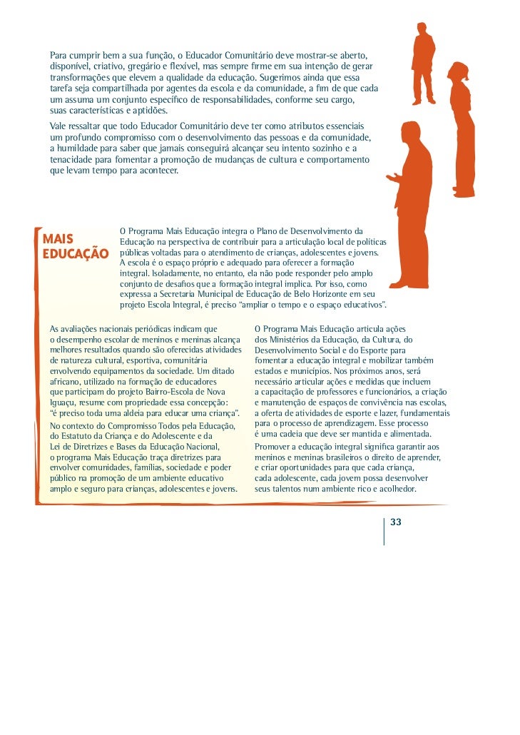 28. 28. Para cumprir bem a sua função, o Educador Comunitário deve mostrar-se aberto,disponível, criativo, gregário e flexível, mas sempre firme em sua intenção de gerartransformações que elevem a qualidade da educação. Sugerimos ainda que essatarefa seja compartilhada por agentes da escola e da comunidade, a fim de que cadaum assuma um conjunto específico de responsabilidades, conforme seu cargo,suas características e aptidões.Vale ressaltar que todo Educador Comunitário deve ter como atributos essenciaisum profundo compromisso com o desenvolvimento das pessoas e da comunidade,a humildade para saber que jamais conseguirá alcançar seu intento sozinho e atenacidade para fomentar a promoção de mudanças de cultura e comportamentoque levam tempo para acontecer. O Programa Mais Educação integra o Plano de Desenvolvimento daMAIS Educação na perspectiva de contribuir para a articulação local de políticasEDUCAÇÃO públicas voltadas para o atendimento de crianças, adolescentes e jovens. A escola é o espaço próprio e adequado para oferecer a formação integral. Isoladamente, no entanto, ela não pode responder pelo amplo conjunto de desafios que a formação integral implica. Por isso, como expressa a Secretaria Municipal de Educação de Belo Horizonte em seu projeto Escola Integral, é preciso “ampliar o tempo e o espaço educativos”.As avaliações nacionais periódicas indicam que O Programa Mais Educação articula açõeso desempenho escolar de meninos e meninas alcança dos Ministérios da Educação, da Cultura, domelhores resultados quando são oferecidas atividades Desenvolvimento Social e do Esporte parade natureza cultural, esportiva, comunitária fomentar a educação integral e mobilizar tambémenvolvendo equipamentos da sociedade. Um ditado estados e municípios. Nos próximos anos, seráafricano, utilizado na formação de educadores necessário articular ações e medidas que incluemque participam do projeto Bairro-Escola de Nova a capacitação de professores e funcionários, a criaçãoIguaçu, resume com propriedade essa concepção: e manutenção de espaços de convivência nas escolas,“é preciso toda uma aldeia para educar uma criança”. a oferta de atividades de esporte e lazer, fundamentaisNo contexto do Compromisso Todos pela Educação, para o processo de aprendizagem. Esse processodo Estatuto da Criança e do Adolescente e da é uma cadeia que deve ser mantida e alimentada.Lei de Diretrizes e Bases da Educação Nacional, Promover a educação integral significa garantir aoso programa Mais Educação traça diretrizes para meninos e meninas brasileiros o direito de aprender,envolver comunidades, famílias, sociedade e poder e criar oportunidades para que cada criança,público na promoção de um ambiente educativo cada adolescente, cada jovem possa desenvolveramplo e seguro para crianças, adolescentes e jovens. seus talentos num ambiente rico e acolhedor. 33