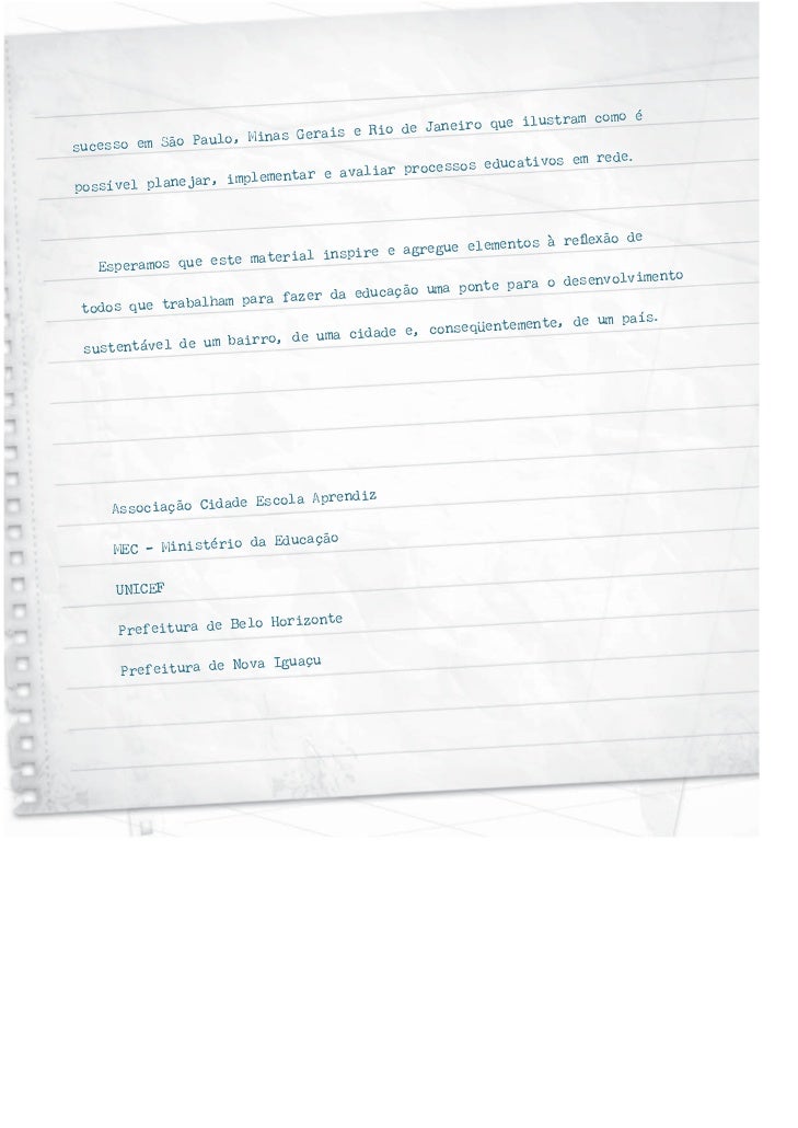 2. 2. como é neiro que ilustram ulo, Minas Gerais e Rio de Jasucesso em São Pa os em rede. processos educativ , implementar e avaliarpossível planejar à reflexão de agregue elementos material inspire e Esperamos que este olvimento nte para o desenv m para fazer da educação uma po todos que trabalha ente, de um país. dade e, conseqüentem bairro, de uma ci sustentável de um Escola Aprendiz Associação Cidade da Educação MEC – Ministério UNICEF Horizonte Prefeitura de Belo Iguaçu Prefeitura de Nova