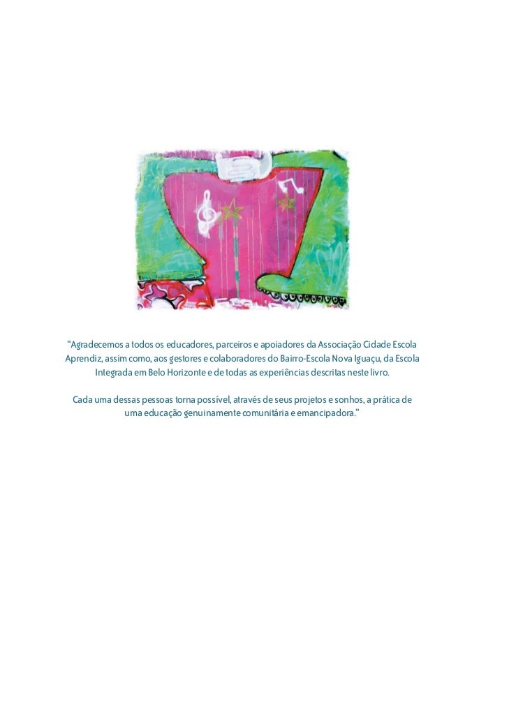 3. 3. “Agradecemos a todos os educadores, parceiros e apoiadores da Associação Cidade EscolaAprendiz, assim como, aos gestores e colaboradores do Bairro-Escola Nova Iguaçu, da Escola Integrada em Belo Horizonte e de todas as experiências descritas neste livro. Cada uma dessas pessoas torna possível, através de seus projetos e sonhos, a prática de uma educação genuinamente comunitária e emancipadora.”