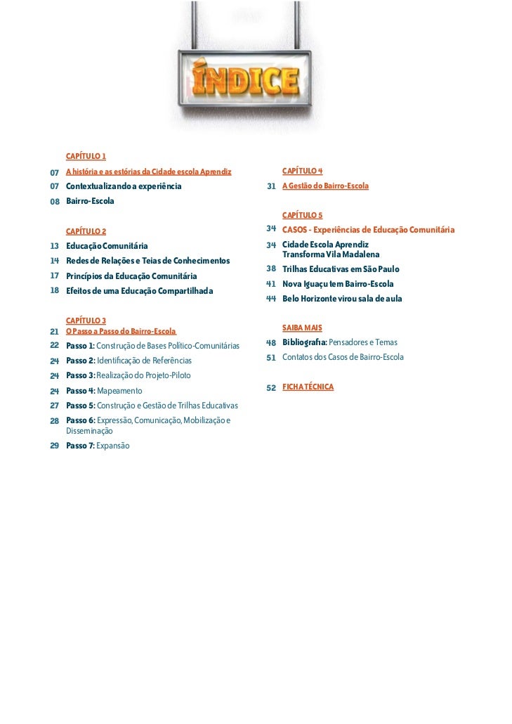 4. 4. CAPÍTULO 107 A história e as estórias da Cidade escola Aprendiz CAPÍTULO 407 Contextualizando a experiência 31 A Gestão do Bairro-Escola08 Bairro-Escola CAPÍTULO 5 CAPÍTULO 2 34 CASOS - Experiências de Educação Comunitária13 Educação Comunitária 34 Cidade Escola Aprendiz Transforma Vila Madalena14 Redes de Relações e Teias de Conhecimentos 38 Trilhas Educativas em São Paulo17 Princípios da Educação Comunitária 41 Nova Iguaçu tem Bairro-Escola18 Efeitos de uma Educação Compartilhada 44 Belo Horizonte virou sala de aula CAPÍTULO 321 O Passo a Passo do Bairro-Escola SAIBA MAIS22 Passo 1: Construção de Bases Político-Comunitárias 48 Bibliografia: Pensadores e Temas24 Passo 2: Identificação de Referências 51 Contatos dos Casos de Bairro-Escola24 Passo 3: Realização do Projeto-Piloto24 Passo 4: Mapeamento 52 FICHA TÉCNICA27 Passo 5: Construção e Gestão de Trilhas Educativas28 Passo 6: Expressão, Comunicação, Mobilização e Disseminação29 Passo 7: Expansão