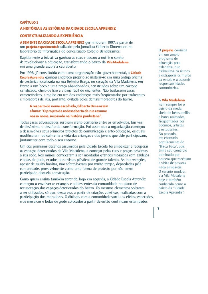 5. 5. CAPÍTULO 1A HISTÓRIA E AS ESTÓRIAS DA CIDADE ESCOLA APRENDIZCONTEXTUALIZANDO A EXPERIÊNCIAA SEMENTE DA CIDADE ESCOLA APRENDIZ germinou em 1997, a partir deum projeto experimental realizado pelo jornalista Gilberto Dimenstein nolaboratório de informática do conceituado Colégio Bandeirantes. O projeto consistia em um amploRapidamente a iniciativa ganhou as ruas e passou a nutrir o sonho programa dede revolucionar a educação, transformando o bairro da Vila Madalena educação paraem uma grande escola a céu aberto. cidadania, queEm 1998, já constituída como uma organização não-governamental, a Cidade estimulava os alunos a extrapolar os murosEscola Aprendiz ganhou endereço próprio ao instalar-se em uma antiga oficina da escola e a assumirde cerâmica localizada na rua Belmiro Braga, no coração da Vila Madalena, em responsabilidadesfrente a um beco e uma praça abandonados, construídos sobre um córrego comunitárias.canalizado, cheio de lixo e vítima fácil de enchentes. Não bastassem essascaracterísticas, a região era um dos endereços mais freqüentados por traficantese moradores de rua, portanto, evitada pelos demais moradores do bairro. A Vila Madalena A respeito do nome escolhido, Gilberto Dimenstein nem sempre foi o bairro da moda, afirma: “O projeto de redescoberta da rua resume cheio de belos ateliês nosso nome, inspirado na história paulistana”. e bares animados,Todas essas adversidades surtiram efeito contrário entre os envolvidos. Em vez freqüentados porde desânimo, o desafio da transformação. Foi assim que a organização começou boêmios, artistasa desenvolver seus primeiros projetos de comunicação e arte-educação, os quais e estudantes. No passado,modificaram radicalmente a vida das crianças e dos jovens que dele participavam, era chamadojuntamente com todo o seu entorno. popularmente deUm dos primeiros desafios assumidos pela Cidade Escola foi embelezar e recuperar “Risca Faca”, poisos espaços deteriorados da Vila Madalena, a começar pelas ruas e praças próximas tinha seu comércioa sua sede. Nos muros, começaram a ser montados grandes mosaicos com azulejos dominado pore bolas de gude, criados por artistas plásticos de grande talento. As intervenções, botecos que recebiamapesar de muito bonitas, não sobreviveram por muito tempo, depredadas pela a visita de pessoascomunidade, provavelmente como uma forma de protesto por não terem nada amigáveis.participado daquela construção. O cenário mudou, e a Vila MadalenaComo quem ensina também aprende, logo em seguida, a Cidade Escola Aprendiz hoje é tambémcomeçou a envolver as crianças e adolescentes da comunidade no plano de conhecida como orecuperação dos espaços deteriorados do bairro. Os mesmos elementos voltaram bairro da “Cidadea ser utilizados, só que, dessa vez, a partir de criações coletivas, realizadas com a Escola Aprendiz”.participação dos moradores. O diálogo com a comunidade surtiu os efeitos esperados,e os mosaicos e bolas de gude colocados a partir de então continuam estampados 7