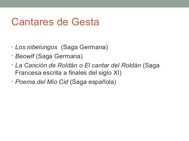 11. 11. Cantares de Gesta • Los nibelungos (Saga Germana) • Beowlf (Saga Germana) • La Canción de Roldán o El cantar del Roldán (Saga Francesa escrita a finales del siglo XI) • Poema del Mio Cid (Saga española)