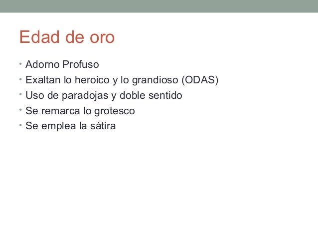 19. 19. Edad de oro • Adorno Profuso • Exaltan lo heroico y lo grandioso (ODAS) • Uso de paradojas y doble sentido • Se remarca lo grotesco • Se emplea la sátira