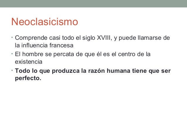 23. 23. Neoclasicismo • Comprende casi todo el siglo XVIII, y puede llamarse de la influencia francesa • El hombre se percata de que él es el centro de la existencia • Todo lo que produzca la razón humana tiene que ser perfecto.