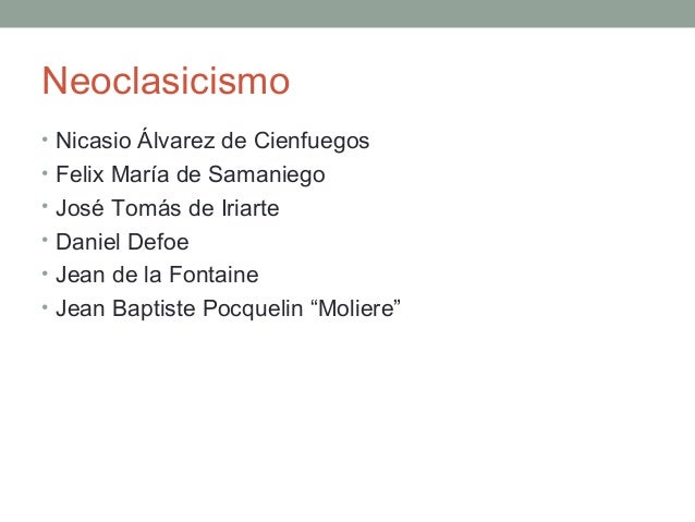 27. 27. Neoclasicismo • Nicasio Álvarez de Cienfuegos • Felix María de Samaniego • José Tomás de Iriarte • Daniel Defoe • Jean de la Fontaine • Jean Baptiste Pocquelin “Moliere”