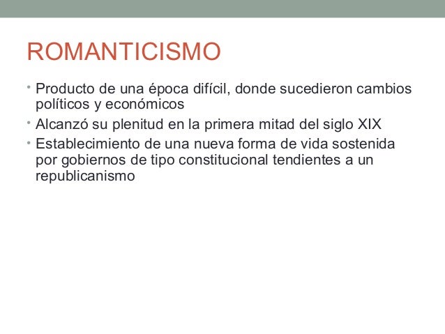 29. 29. ROMANTICISMO • Producto de una época difícil, donde sucedieron cambios políticos y económicos • Alcanzó su plenitud en la primera mitad del siglo XIX • Establecimiento de una nueva forma de vida sostenida por gobiernos de tipo constitucional tendientes a un republicanismo