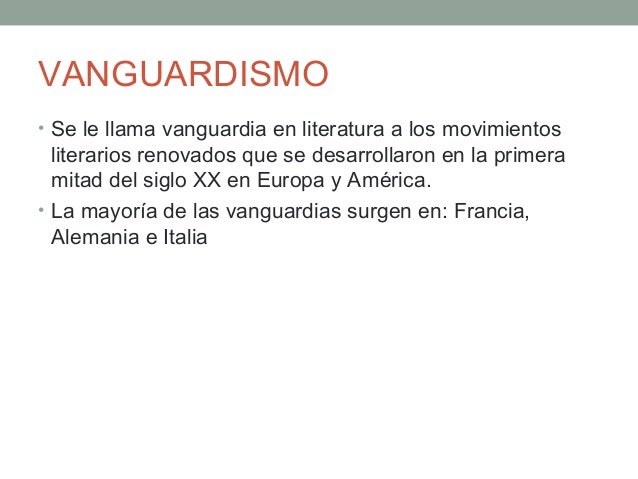 45. 45. VANGUARDISMO • Se le llama vanguardia en literatura a los movimientos literarios renovados que se desarrollaron en la primera mitad del siglo XX en Europa y América. • La mayoría de las vanguardias surgen en: Francia, Alemania e Italia