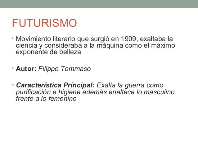 48. 48. FUTURISMO • Movimiento literario que surgió en 1909, exaltaba la ciencia y consideraba a la máquina como el máximo exponente de belleza • Autor: Filippo Tommaso • Característica Principal: Exalta la guerra como purificación e higiene además enaltece lo masculino frente a lo femenino