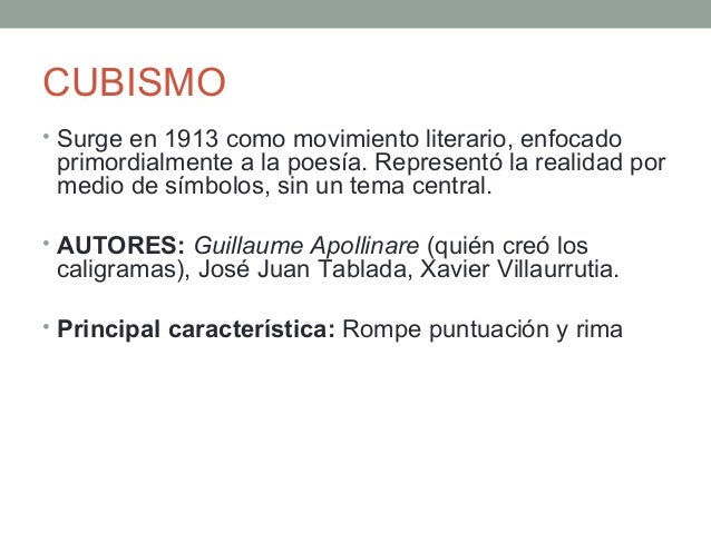 49. 49. CUBISMO • Surge en 1913 como movimiento literario, enfocado primordialmente a la poesía. Representó la realidad por medio de símbolos, sin un tema central. • AUTORES: Guillaume Apollinare (quién creó los caligramas), José Juan Tablada, Xavier Villaurrutia. • Principal característica: Rompe puntuación y rima
