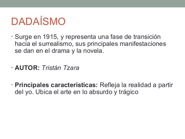 50. 50. DADAÍSMO • Surge en 1915, y representa una fase de transición hacia el surrealismo, sus principales manifestaciones se dan en el drama y la novela. • AUTOR: Tristán Tzara • Principales características: Refleja la realidad a partir del yo. Ubica el arte en lo absurdo y trágico