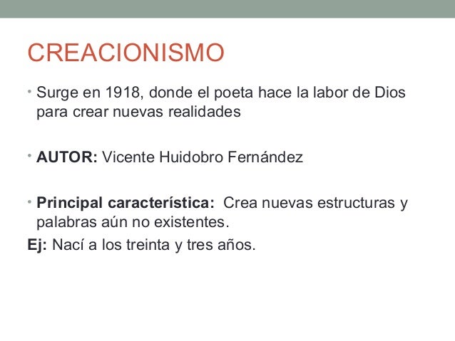 51. 51. CREACIONISMO • Surge en 1918, donde el poeta hace la labor de Dios para crear nuevas realidades • AUTOR: Vicente Huidobro Fernández • Principal característica: Crea nuevas estructuras y palabras aún no existentes. Ej: Nací a los treinta y tres años.