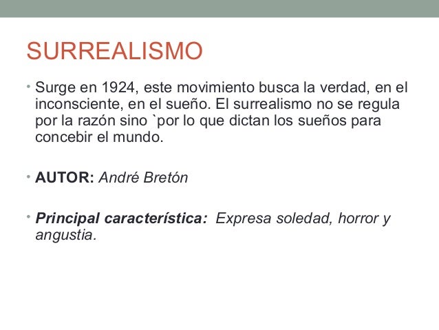 54. 54. SURREALISMO • Surge en 1924, este movimiento busca la verdad, en el inconsciente, en el sueño. El surrealismo no se regula por la razón sino `por lo que dictan los sueños para concebir el mundo. • AUTOR: André Bretón • Principal característica: Expresa soledad, horror y angustia.