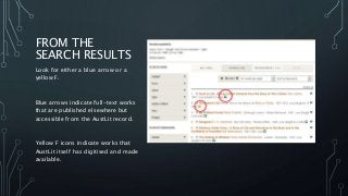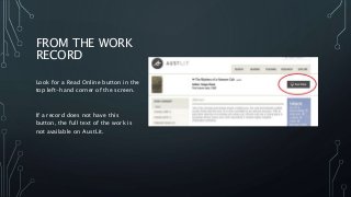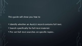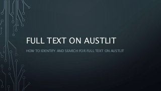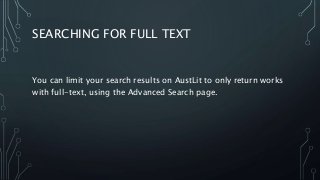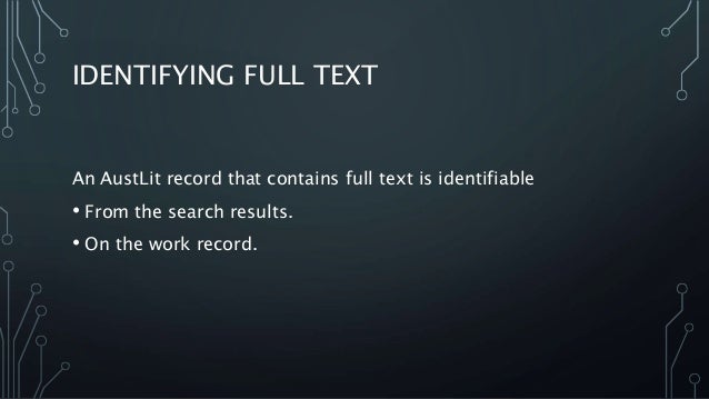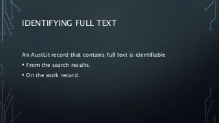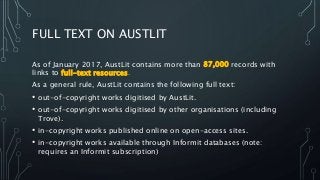 A brief guide to how to identify and search for full-text works on the AustLit database.