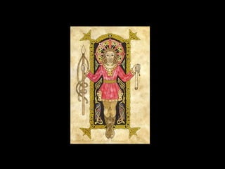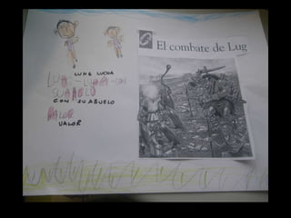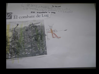 El documento resume la leyenda celta de Lugh. Cuenta que Lugh era la deidad más grande de los celtas, conocido por su fuerza y habilidad. La leyenda cuenta que el druida Balor predijo que su nieta Ethine moriría a manos de su nieto. Para evitar la profecía, Balor encerró a Ethine en una torre de cristal. Ethine se enamoró de Cian y tuvieron trillizos, pero Balor arrojó a los bebés al mar. Solo Lugh sobrevivió y obtuvo poder