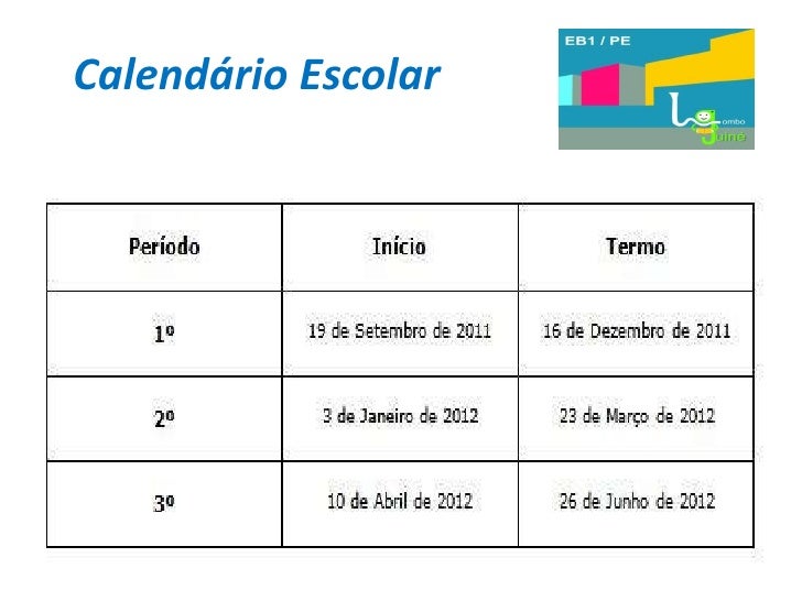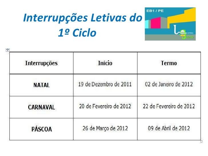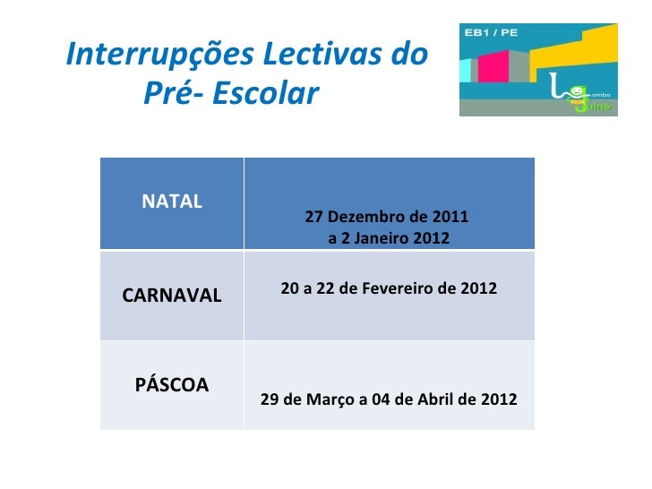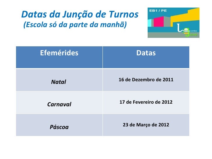 14. 14. Datas da Junção de Turnos (Escola só da parte da manhã) Efemérides Datas Natal 16 de Dezembro de 2011 Carnaval 17 de Fevereiro de 2012 Páscoa 23 de Março de 2012